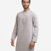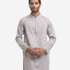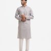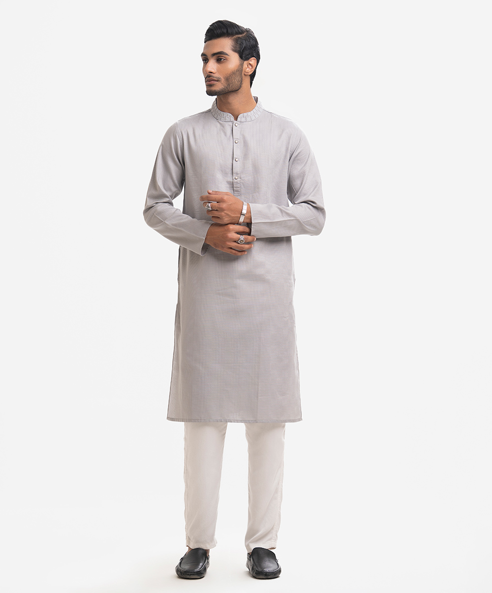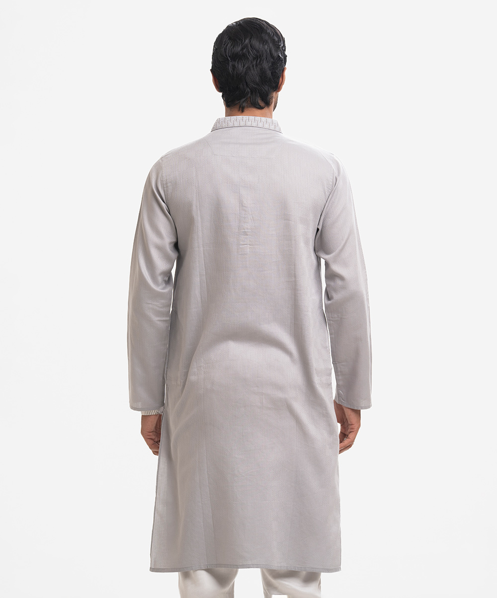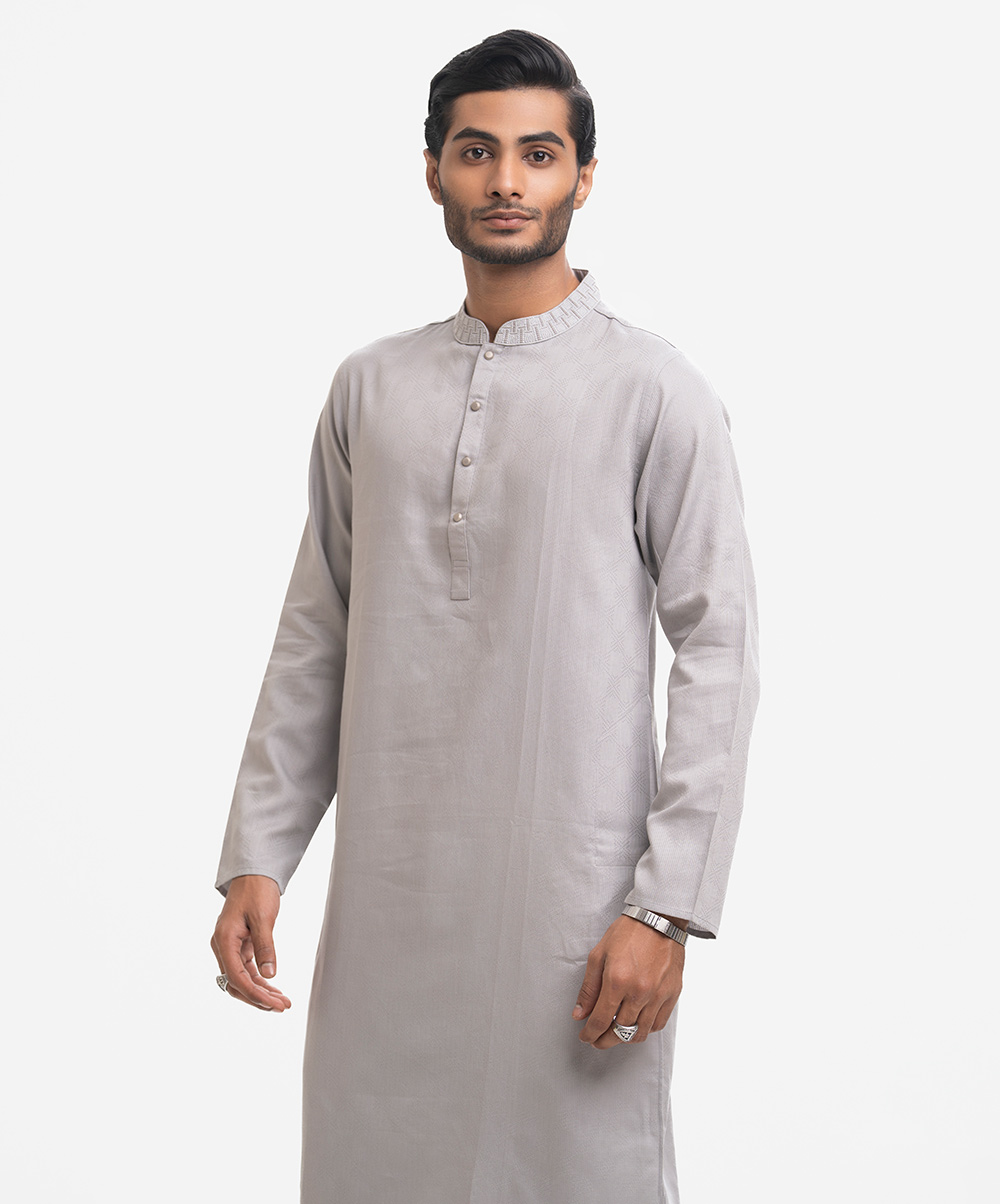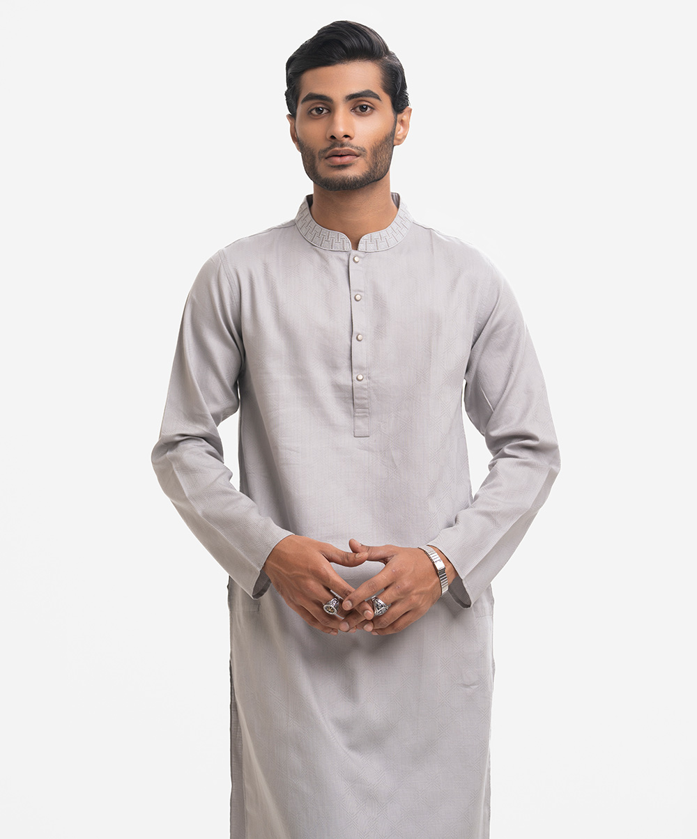 Men’s fitted panjabi in cotton jacquard fabric. Long sleeves, inseam side pockets. Embroidery on the collar.