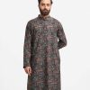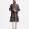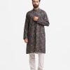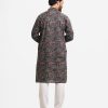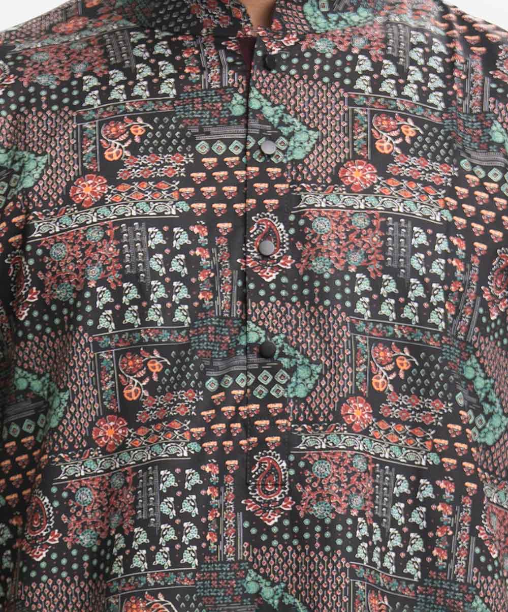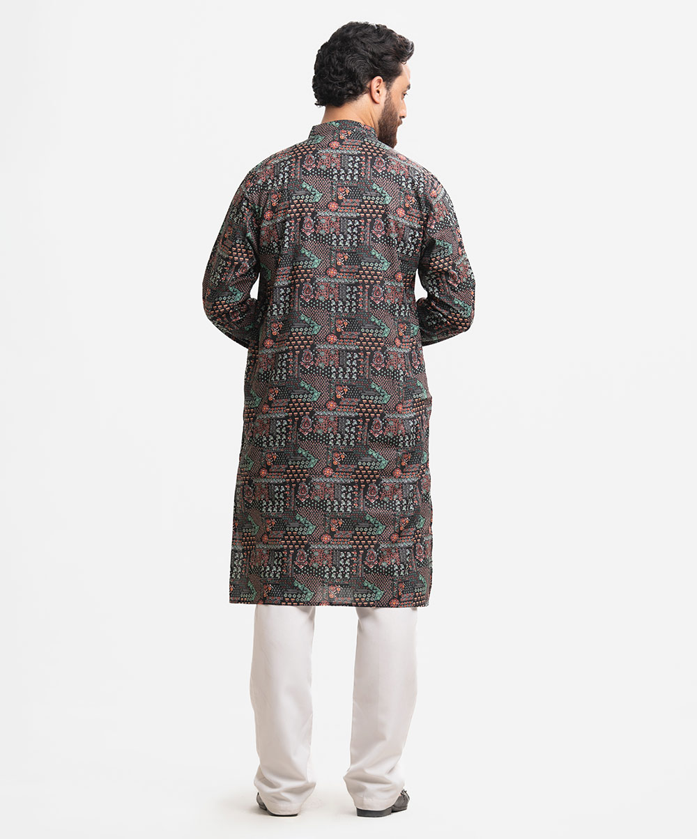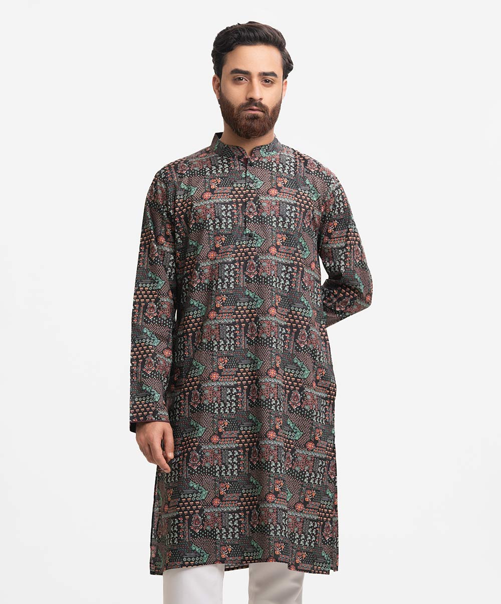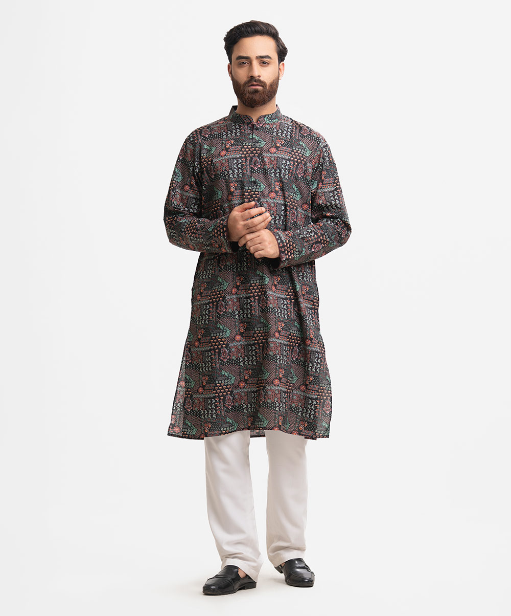 Men’s fitted panjabi in printed cotton fabric. Mandarin collar, full sleeves and inseam pockets.