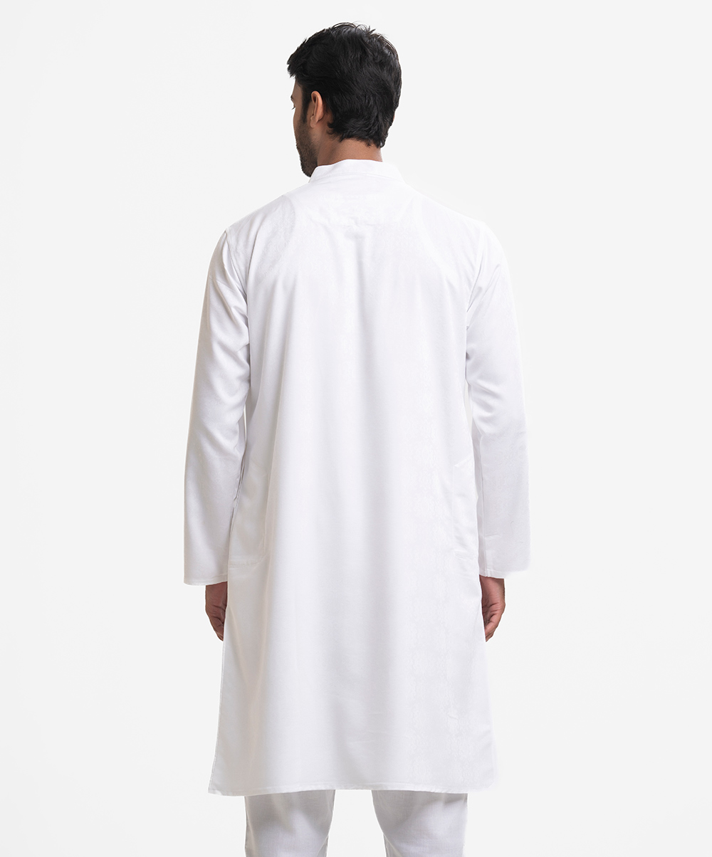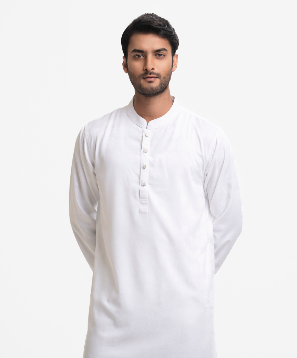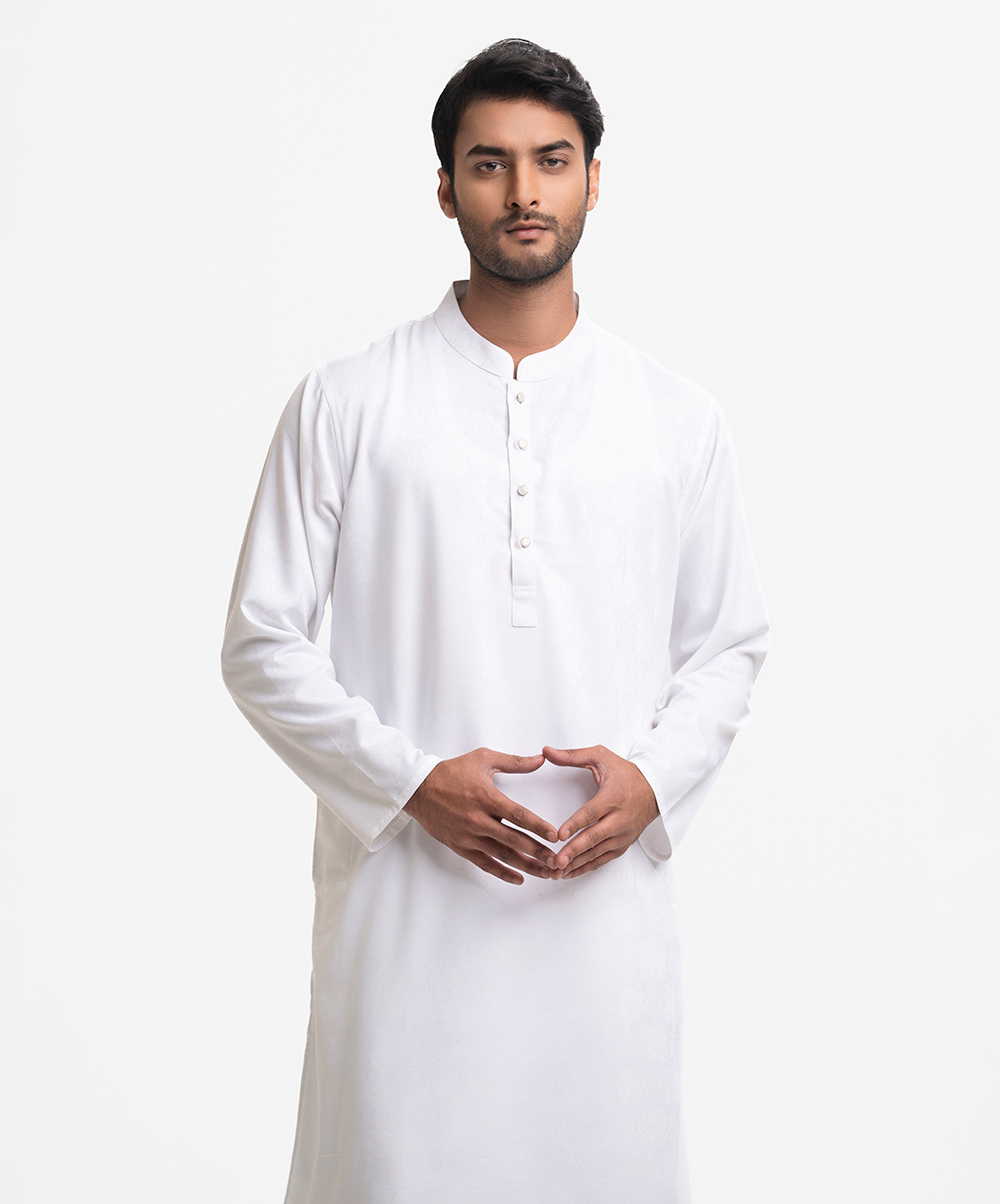 Men’s fitted panjabi in cotton Jacquard fabric. Mandarin collar, metal buttons placket. Inseam side pockets.