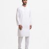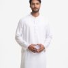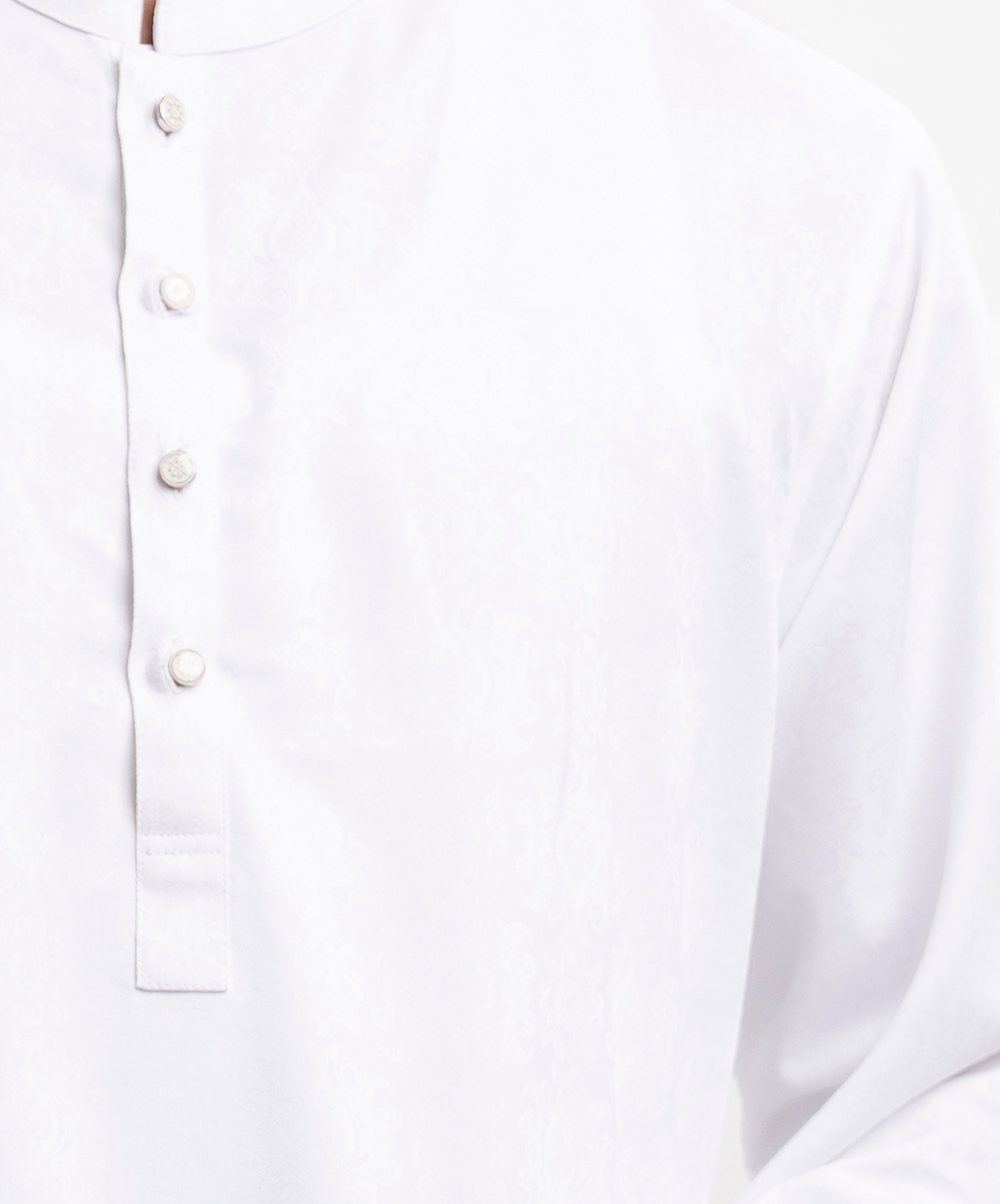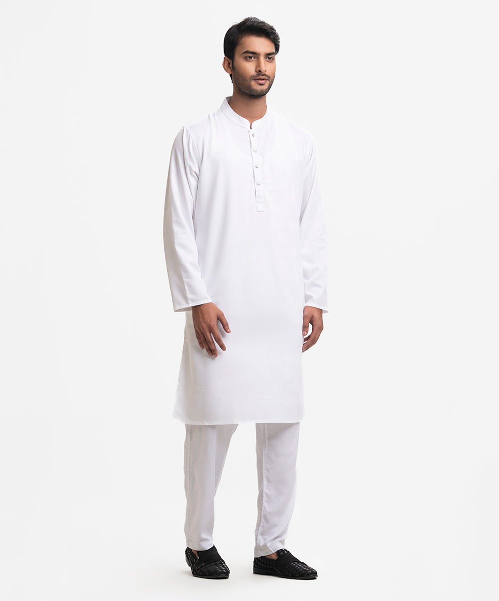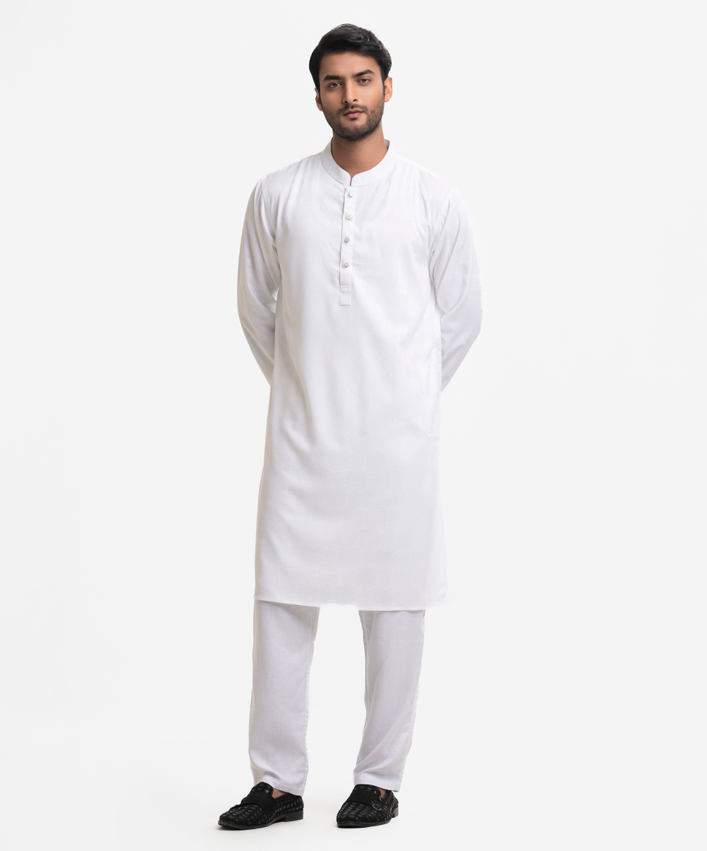 Men’s fitted panjabi in cotton Jacquard fabric. Mandarin collar, metal buttons placket. Inseam side pockets.