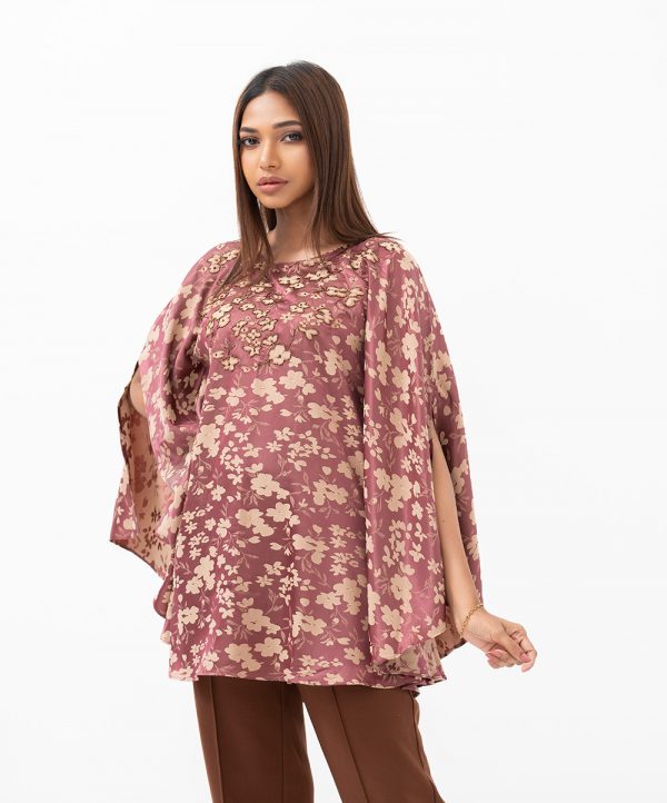 Women’s printed abaya cape in blended fabric. Decorative karchupi details at the front and round neck.