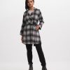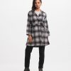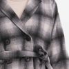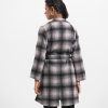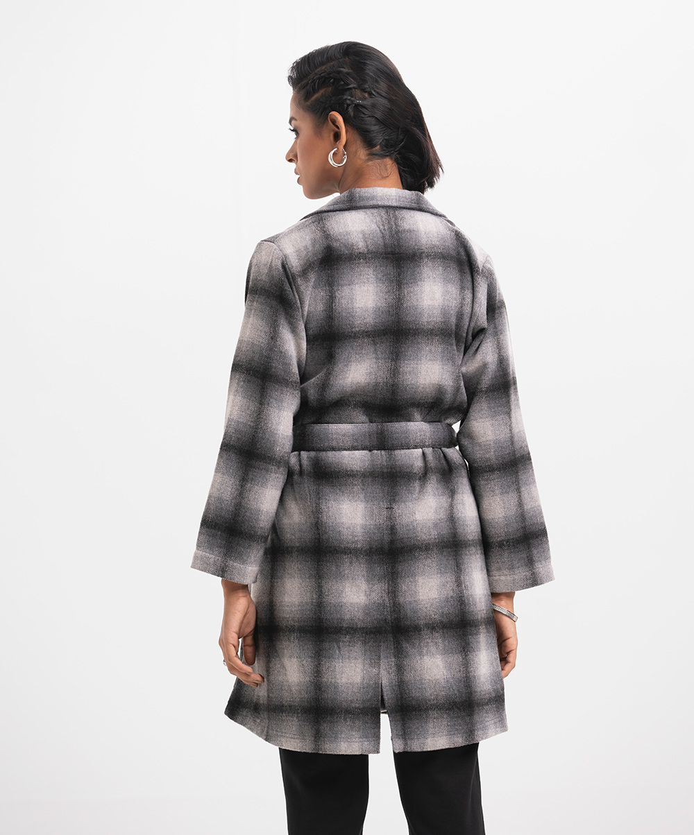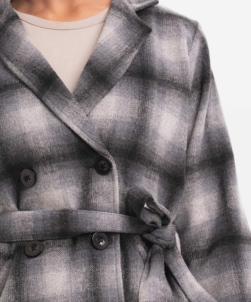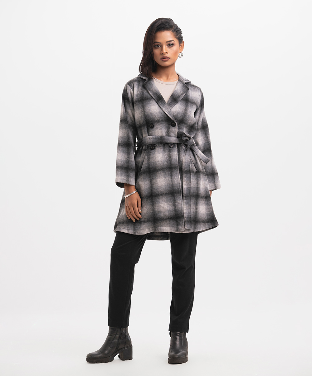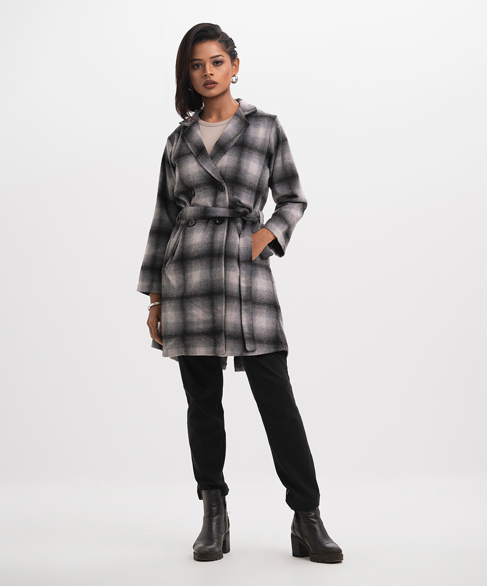 Women’s double-breasted trench coat in flannel check fabric. Lapel collar, long sleeves. Two side pockets and a detachable waist belt.