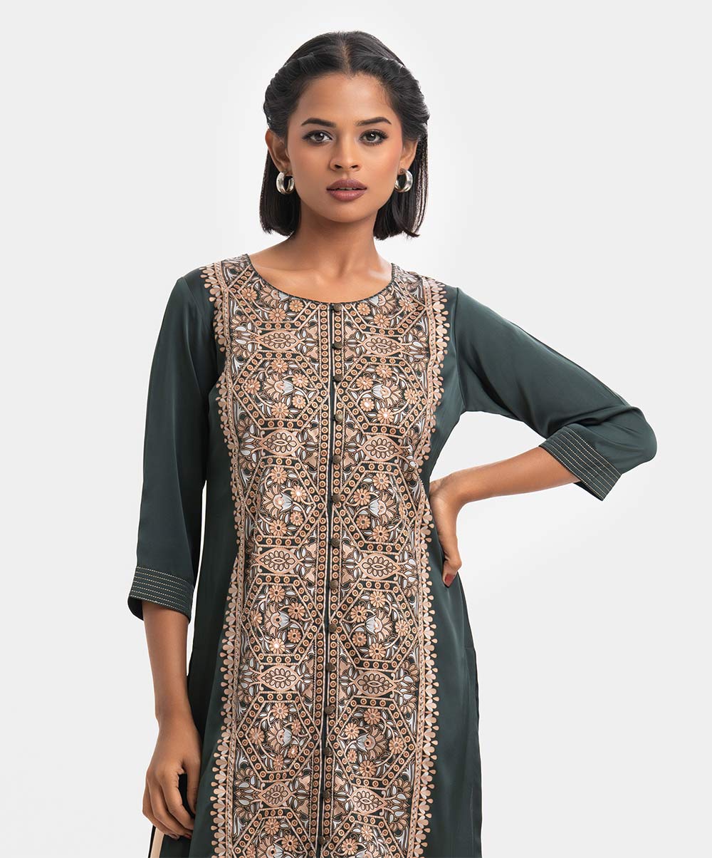 Women’s straight kameez in georgette fabric. Three-quarter sleeves, round neck. Print detail with karchupi at front.