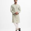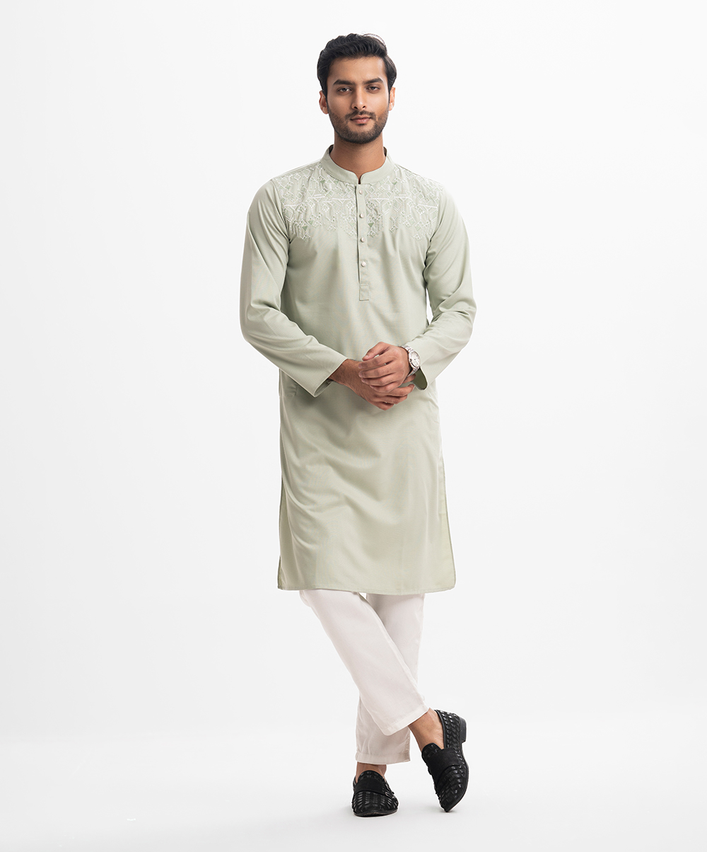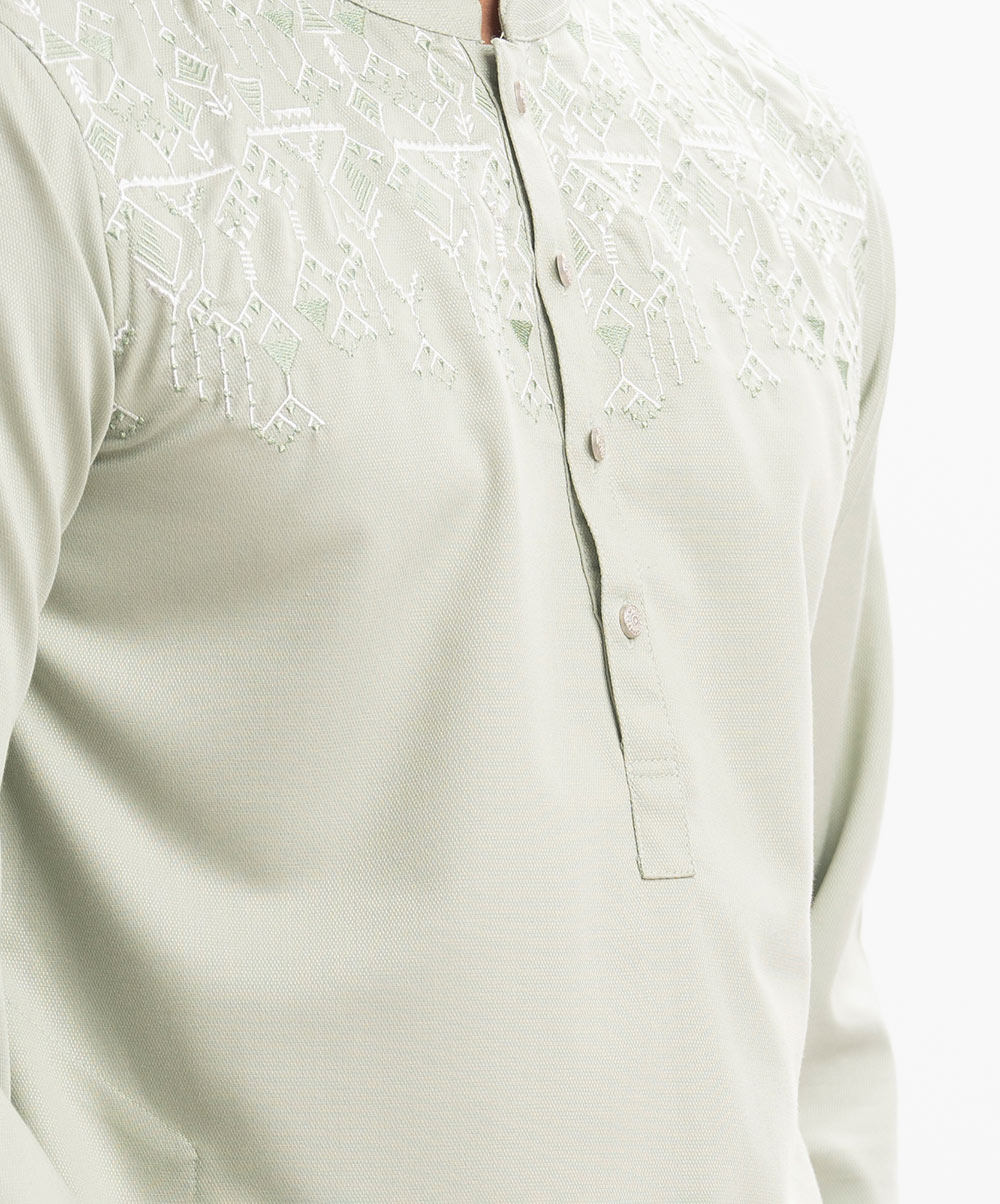 Semi-fitted cotton jacquard panjabi in cotton jacquard fabric. Embroidery on the collar and placket. Inseam side pockets.