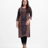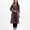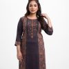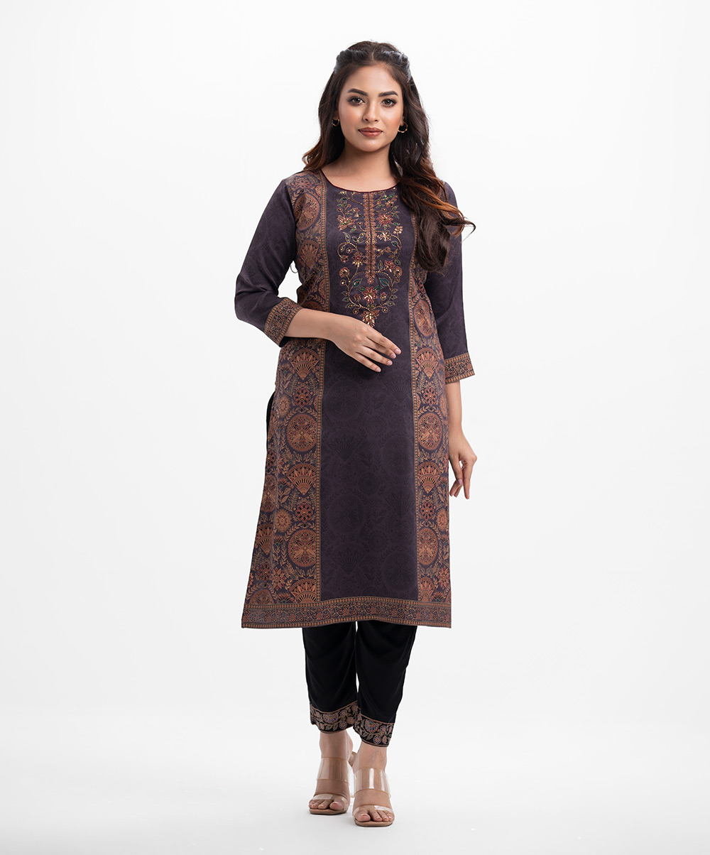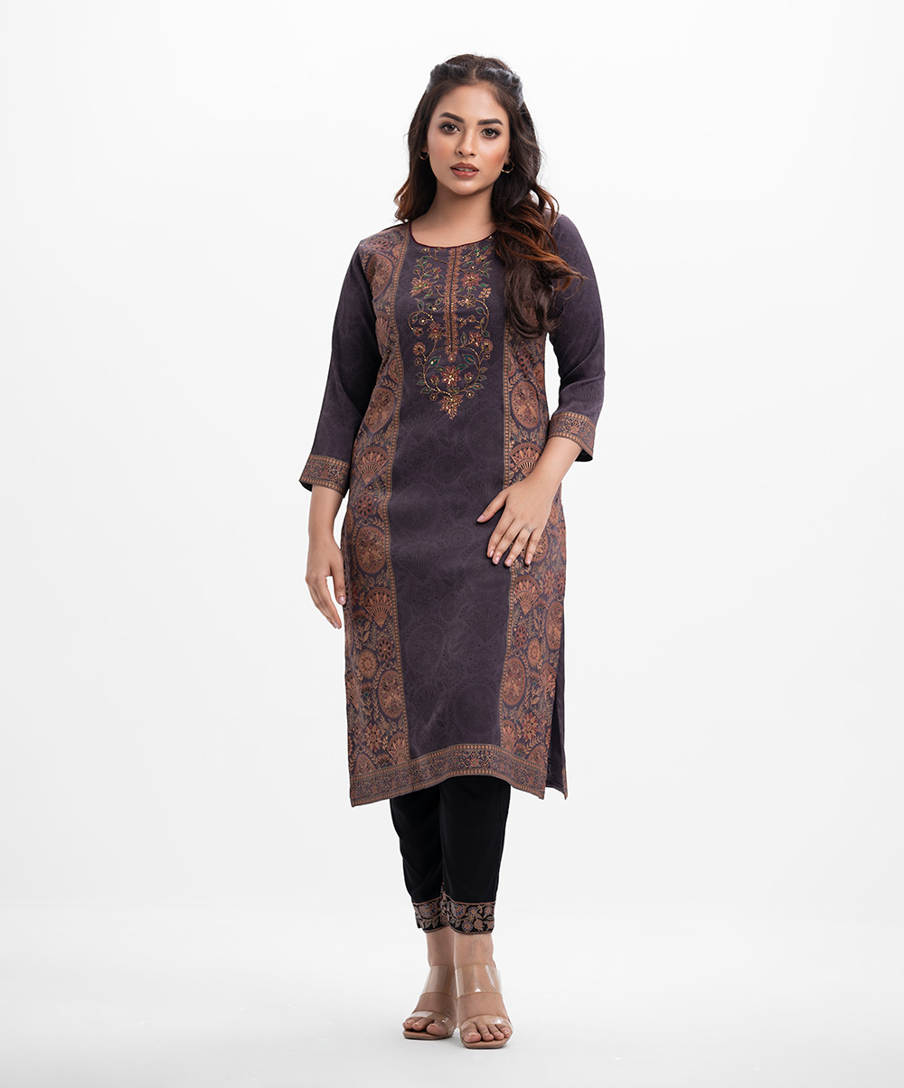 Straight kameez in crepe fabric. Round neck, three-quarter sleeves. Karchupi at the front.