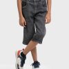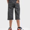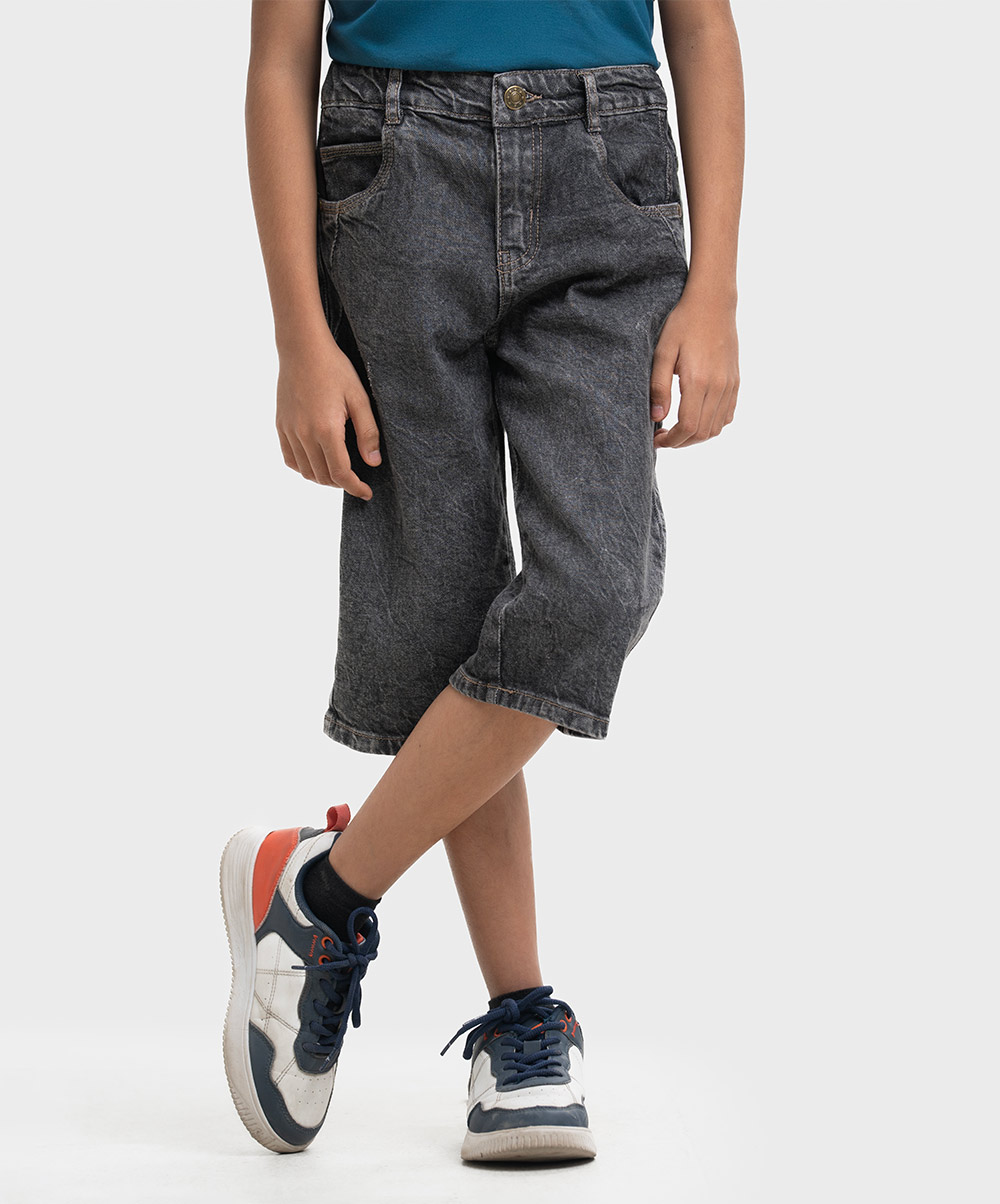 Kid boys printed three-quarter pants in denim fabric. Zipper-fly and a button fastening at the front. Five utility pockets at front and back.