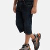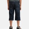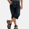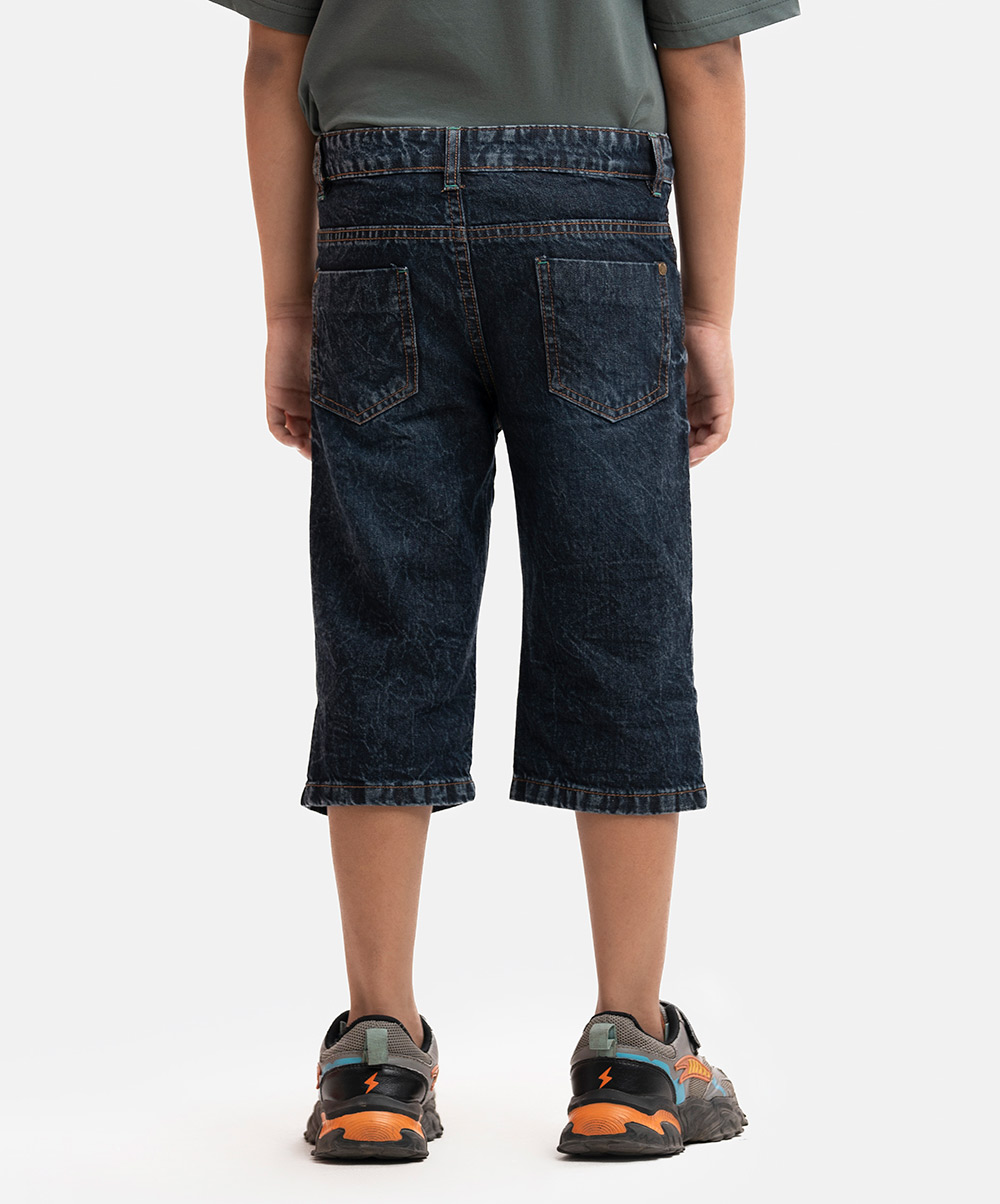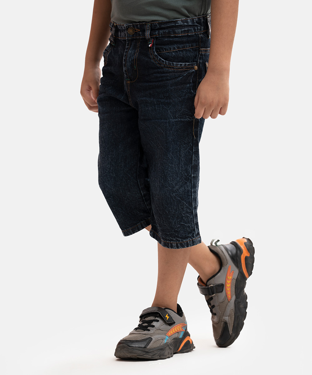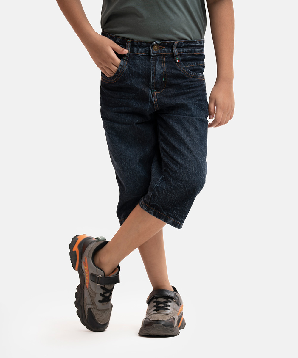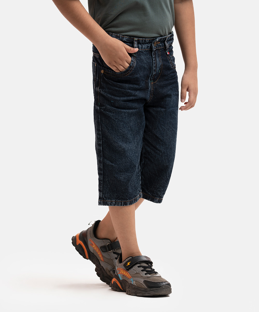 Kid boys three-quarter pants in denim fabric. Zipper-fly and concealed elasticated waistline. Five utility pockets at front and back.