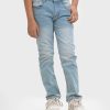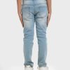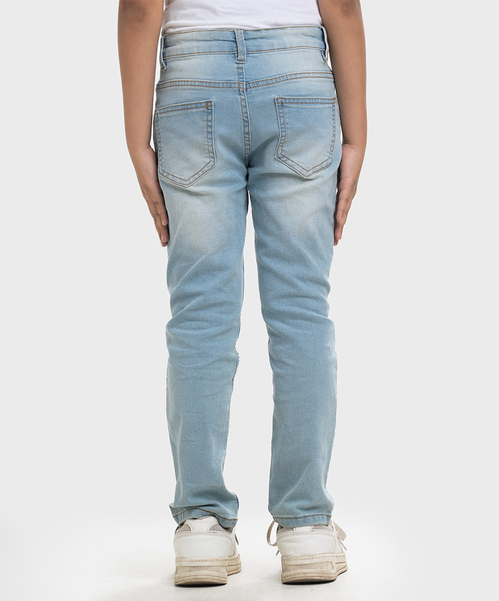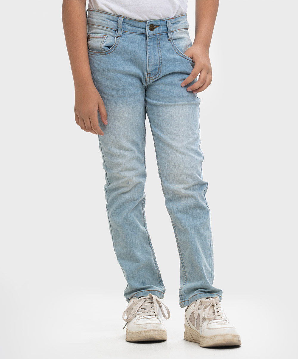 Kid boys long pant in denim fabric. Five pockets and a zipper fly with a metal button.
