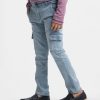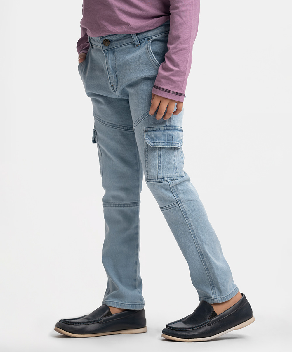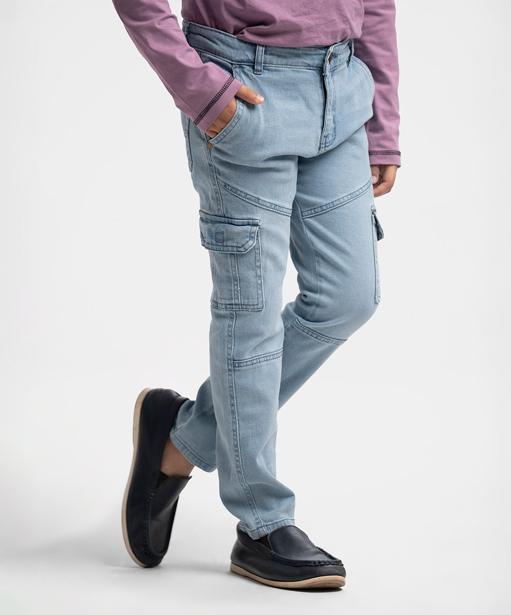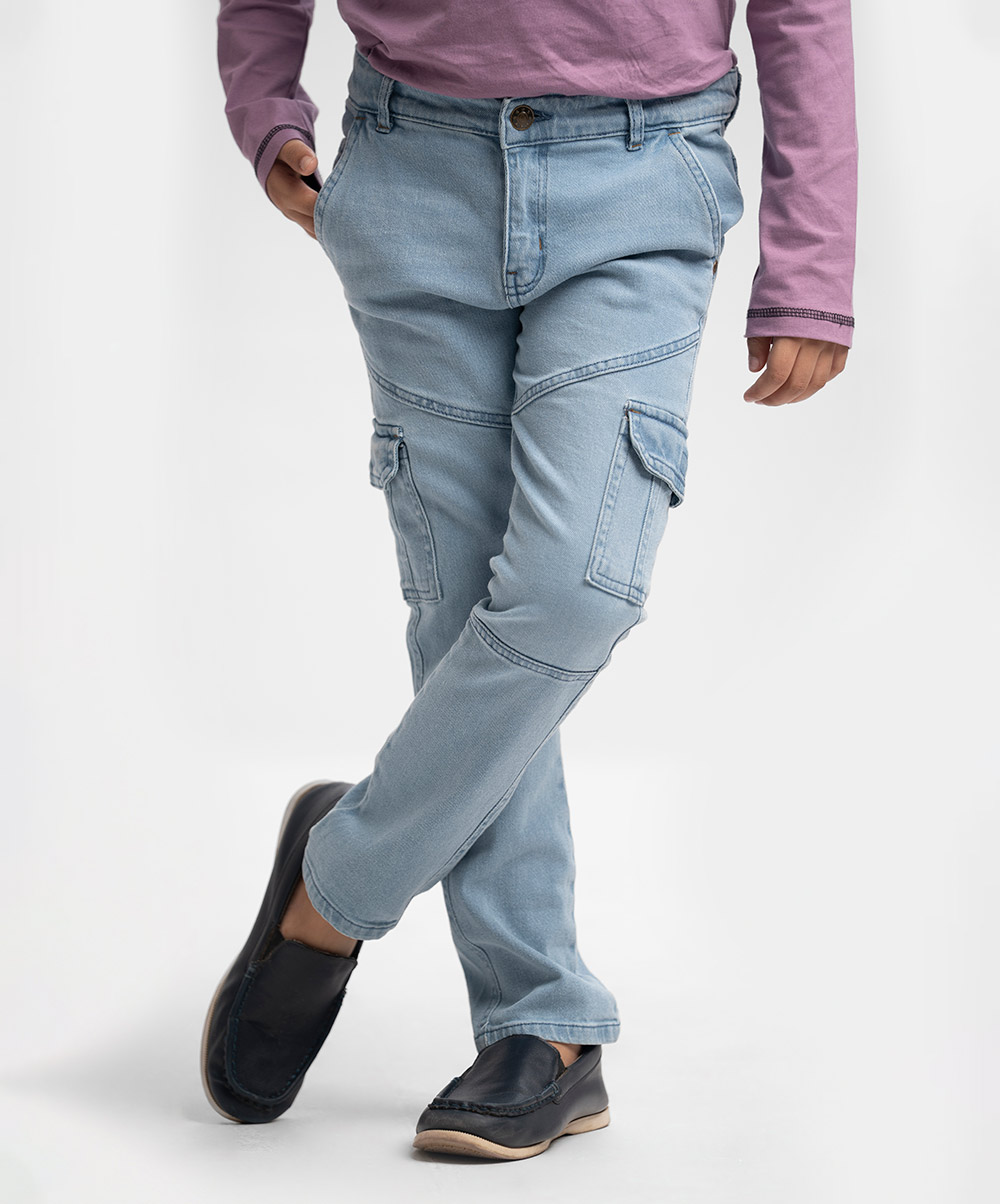 Kid boys long pants in denim fabric. Five pockets with two extra mobile pockets and a zipper fly with a metal button.