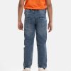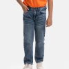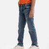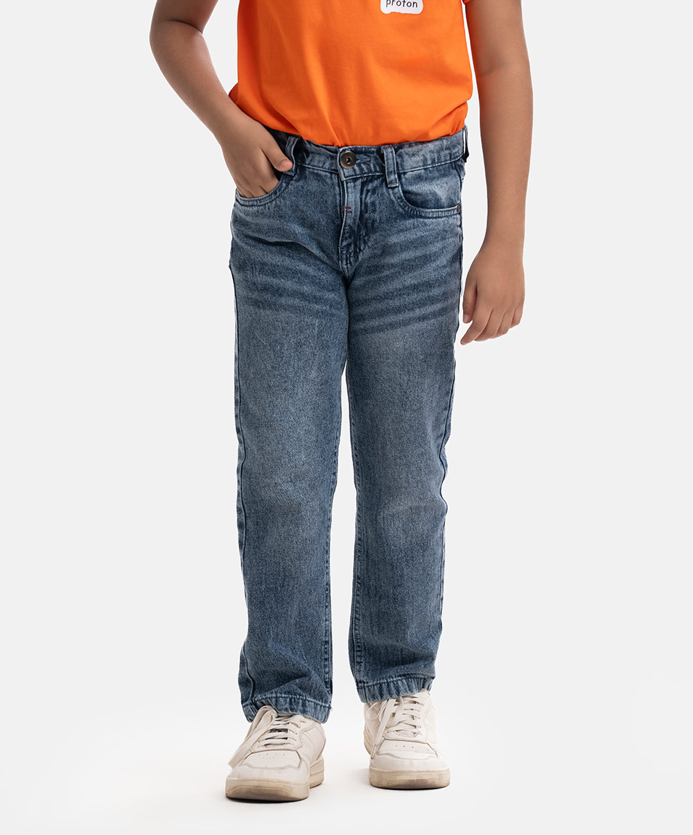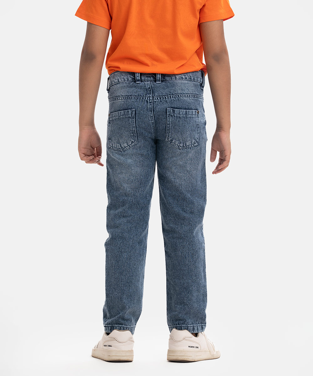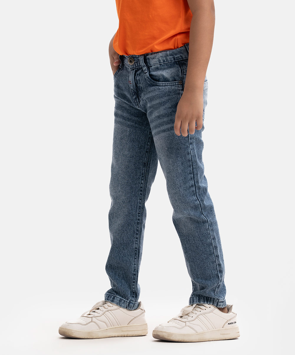 Kid boys long pants in denim fabric. Five pockets and a zipper fly with a metal button.