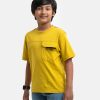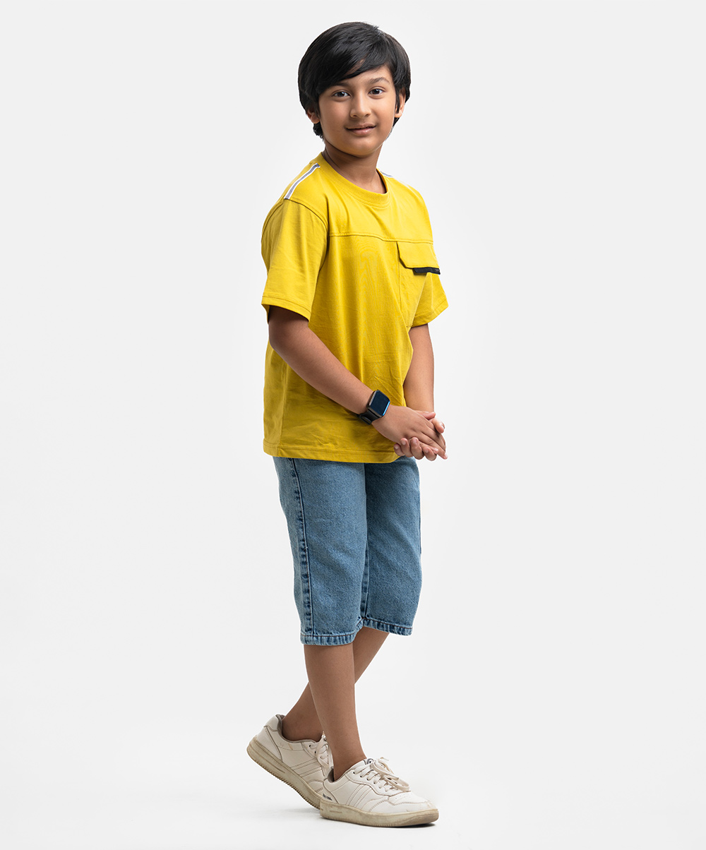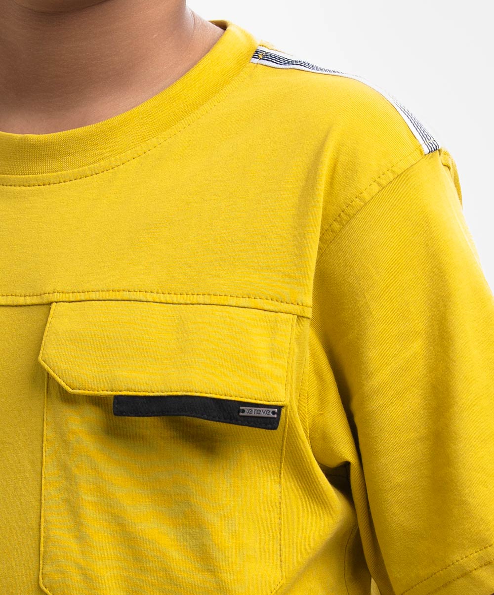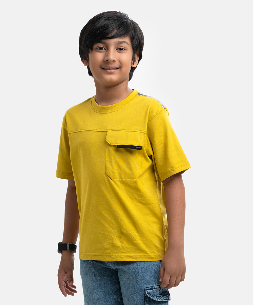 Round neck, short-sleeved kids’ T-shirt in cotton single jersey fabric. Stylish patch pocket on the chest.