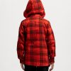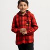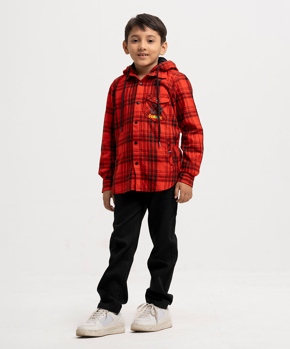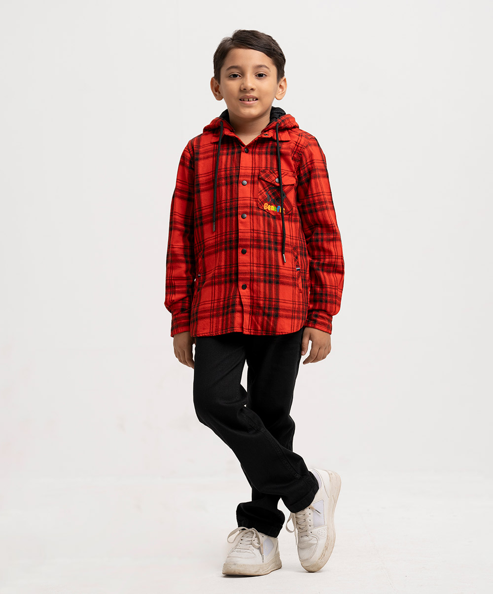 Kid boys plaid pattern long-sleeve hoodie shirt in cotton fabric. Buttons opening at the front, adjustable drawstring at hood. A chest pocket with print detail and two kangaroo pockets.