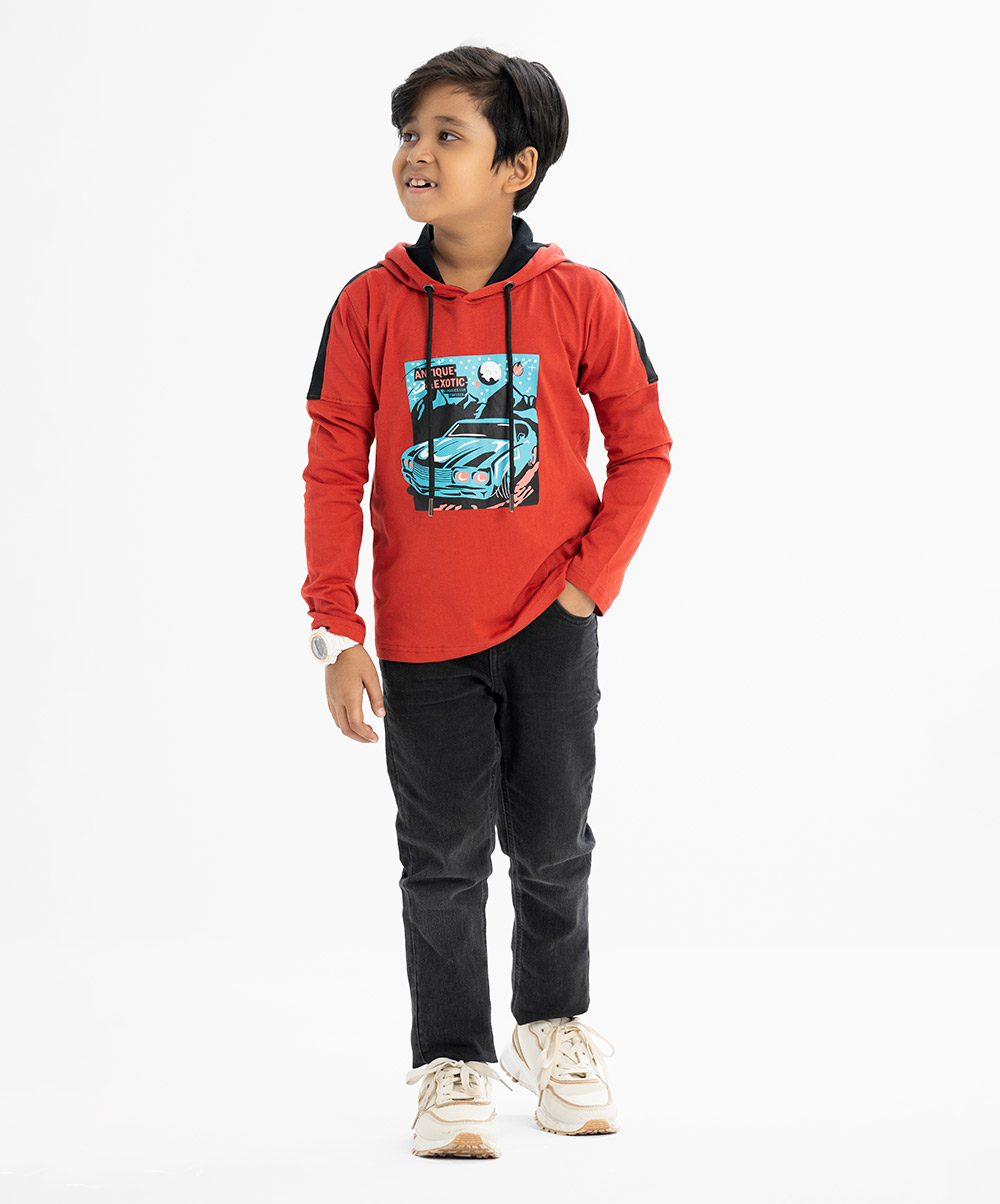 Kid boy’s long-sleeved hoddie T-shirt in cotton single jersey fabric. Car print at the front and matching twill tape on the shoulders.