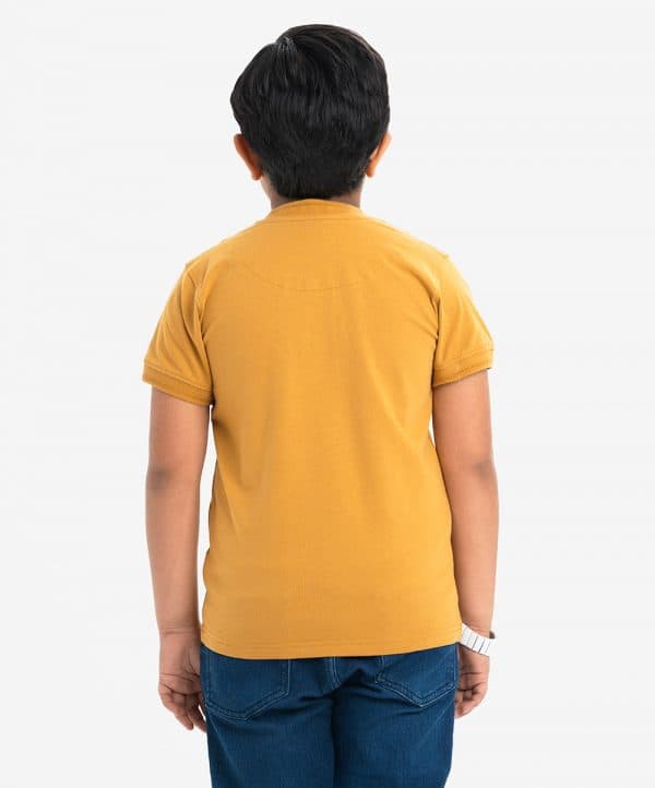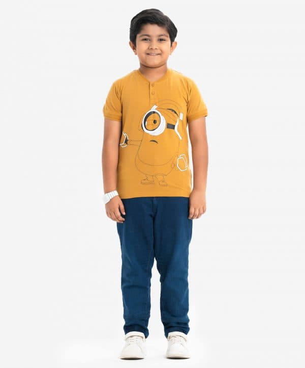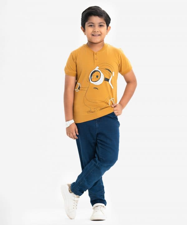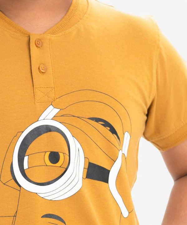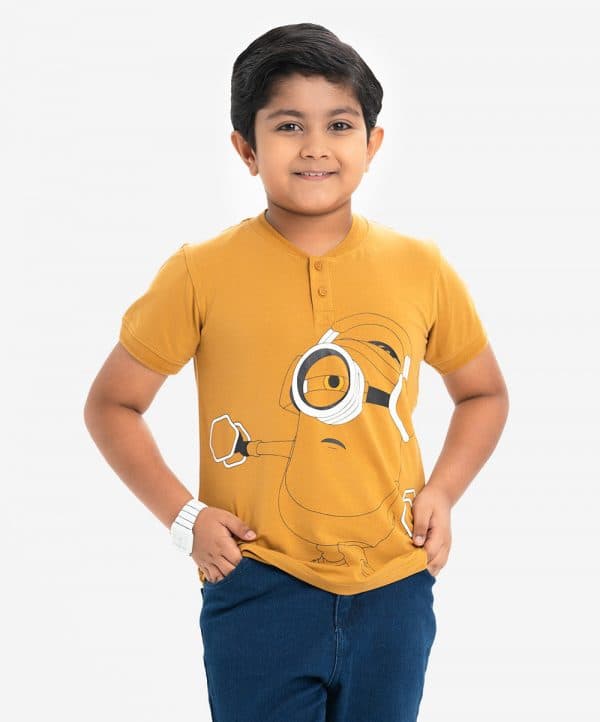 Kid boys’ Henley T-shirt in cotton stretched fabric. Henley neck with front button fastening and short sleeves. Cartoon print on the front.