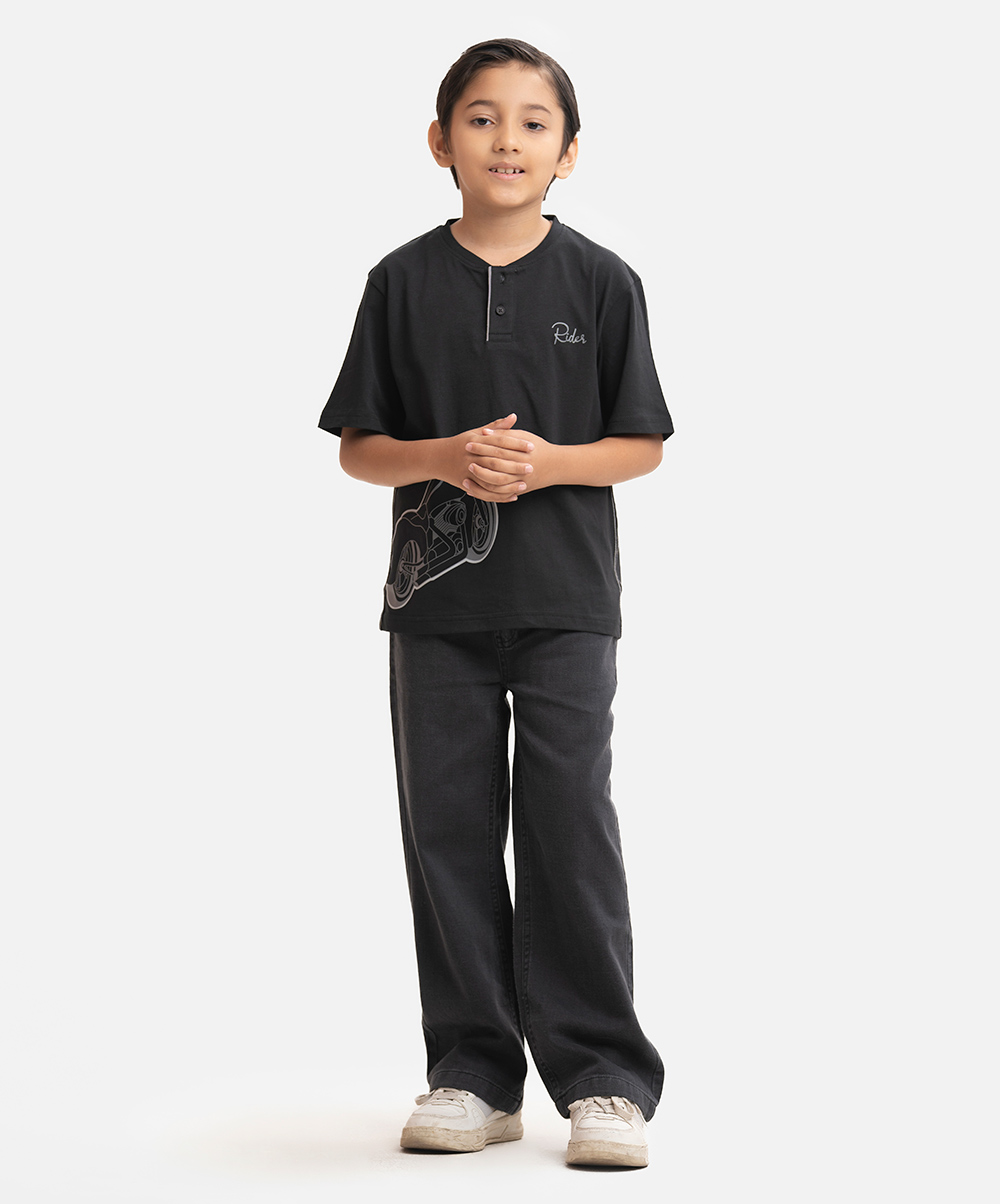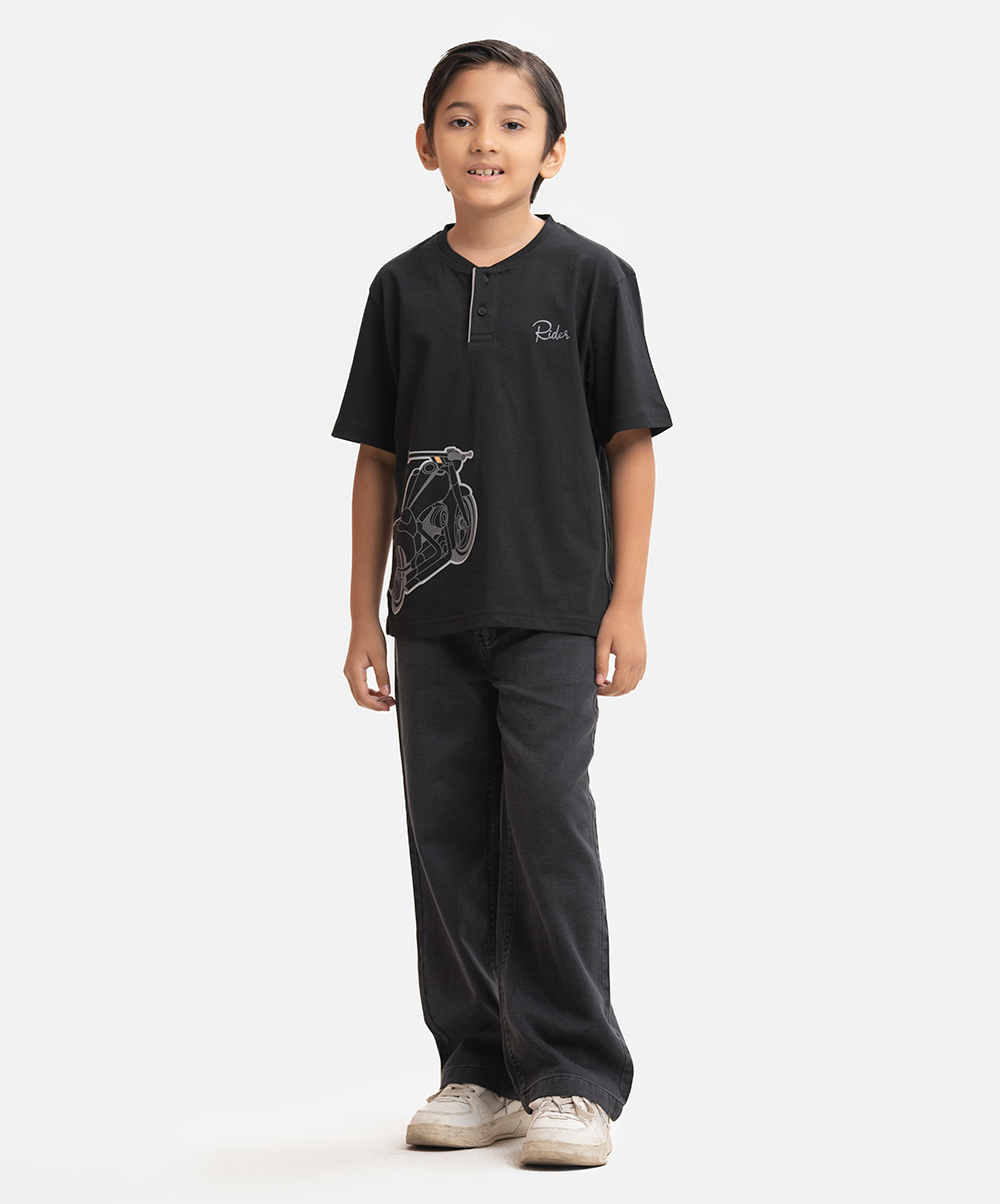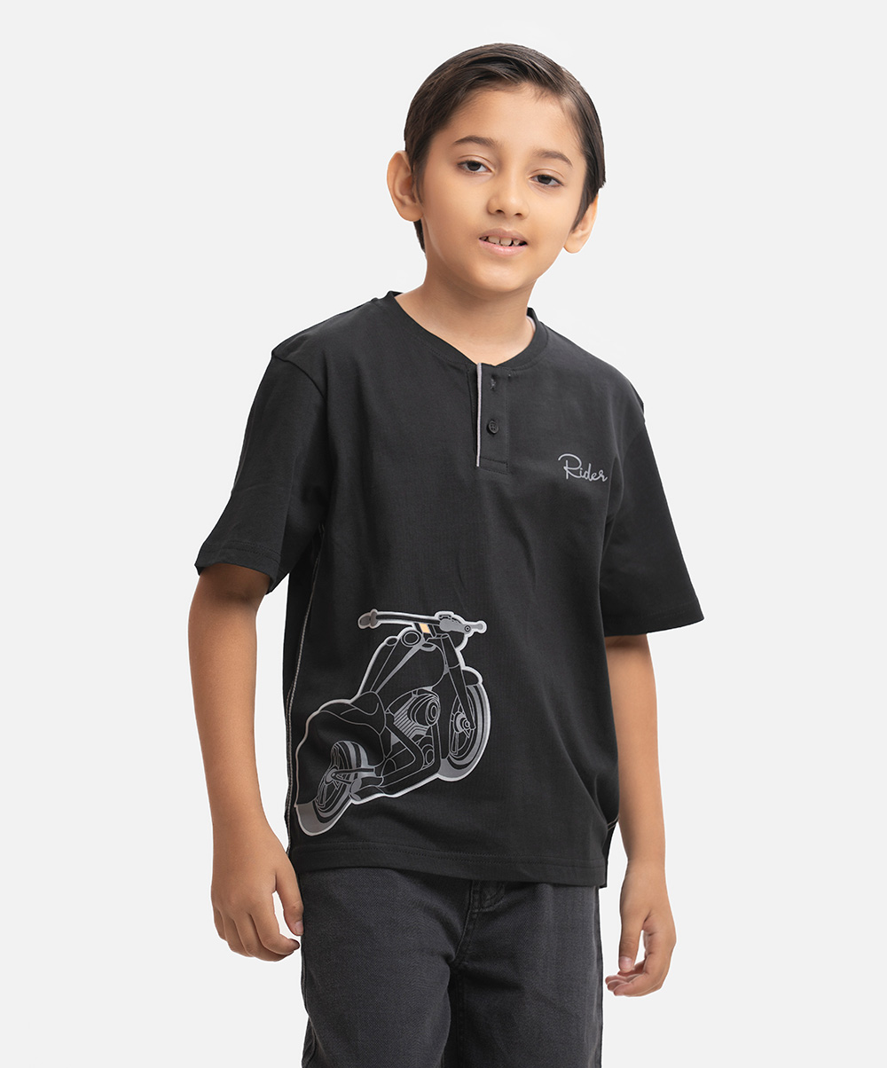 Kid boys henley t-shirt in cotton single jersey fabric. Rounded scoop neckline with front buttons placket, short sleeves and print at front.