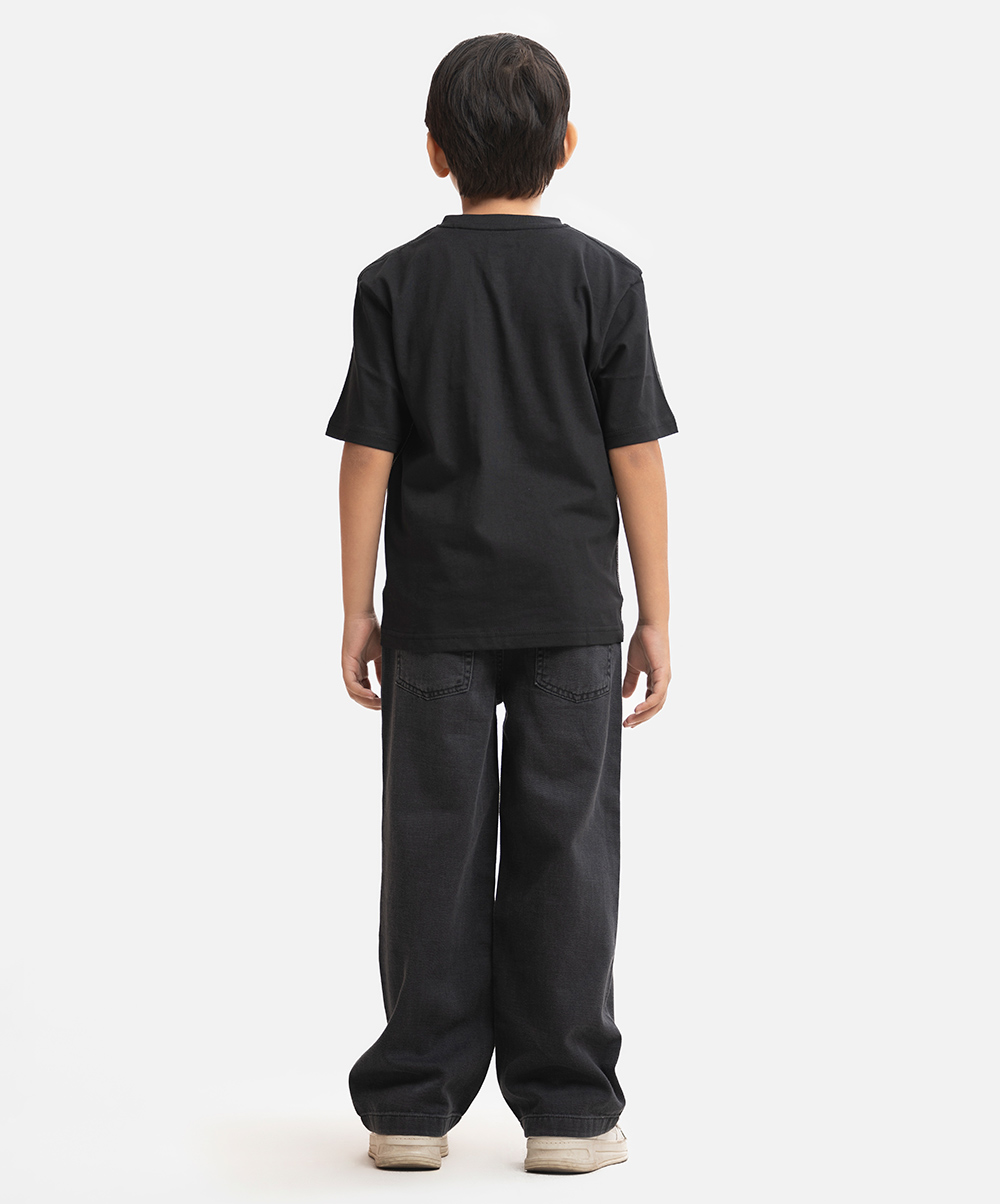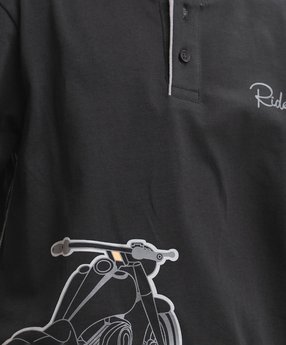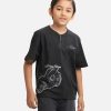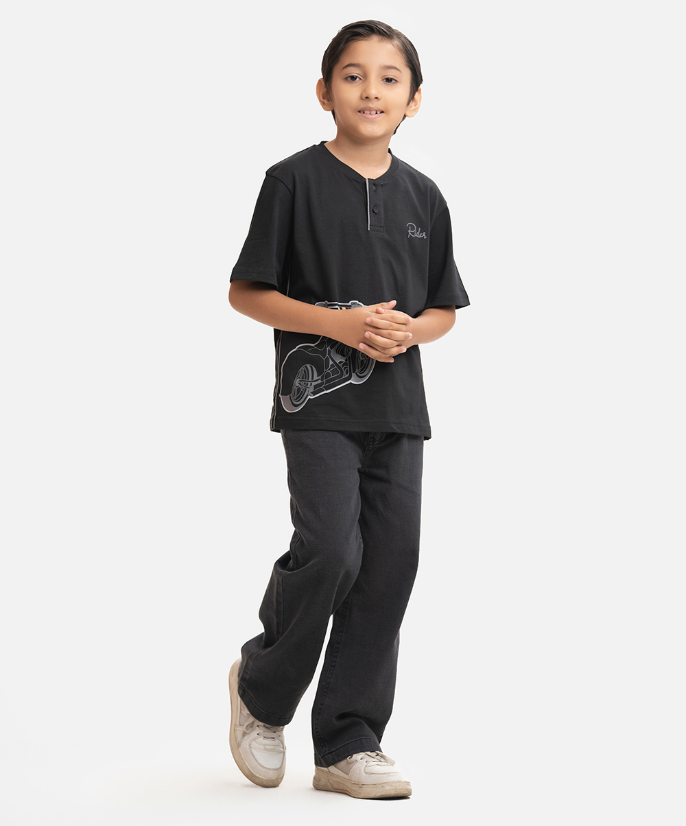 Kid boys henley t-shirt in cotton single jersey fabric. Rounded scoop neckline with front buttons placket, short sleeves and print at front.
