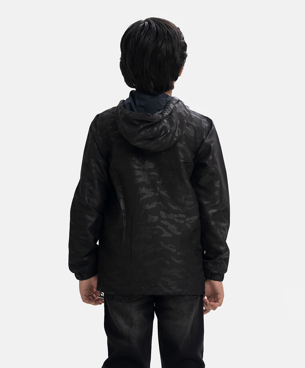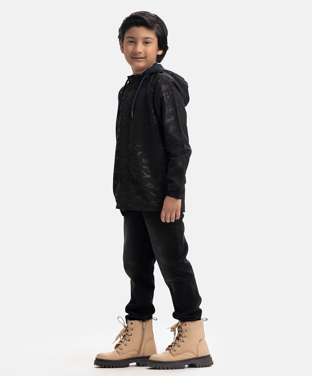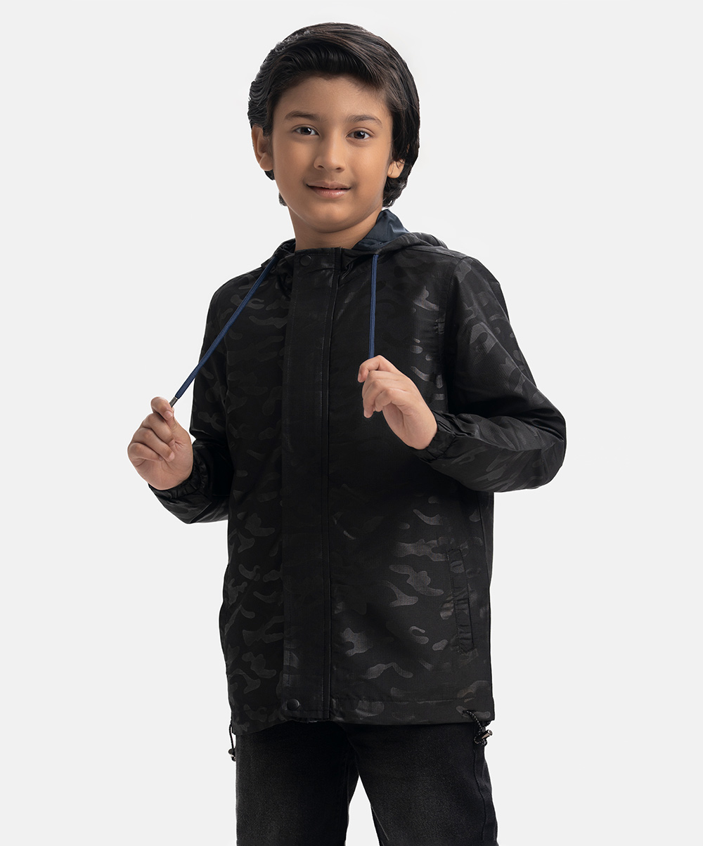 Kid boys animal printed hoodie jacket in blended fabric with taffeta lining. Hidden zipper opening at the front, adjustable drawstring at hood and two side welt pockets.