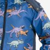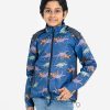 Kids boys dinosaur printed jacket in taffeta fabric. Funnel neck with the hoodie and drawstring cord . front opening zipper and two pockets.