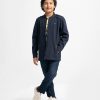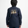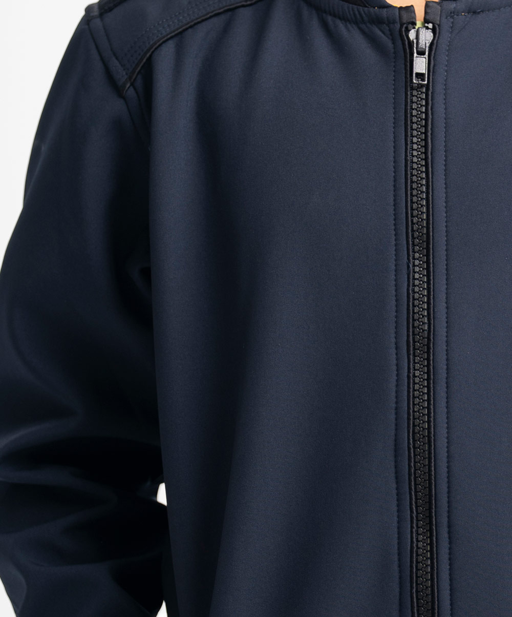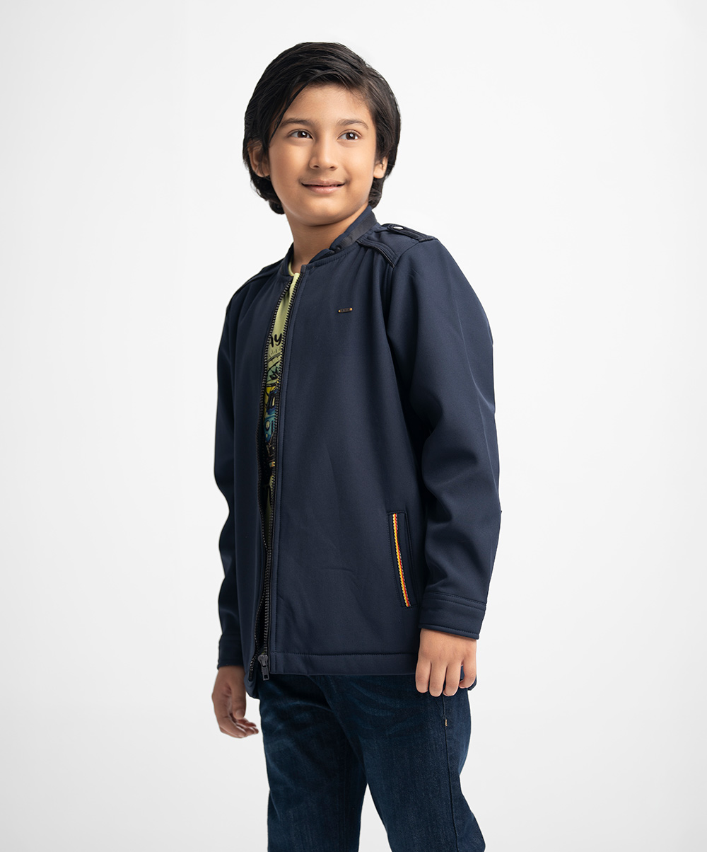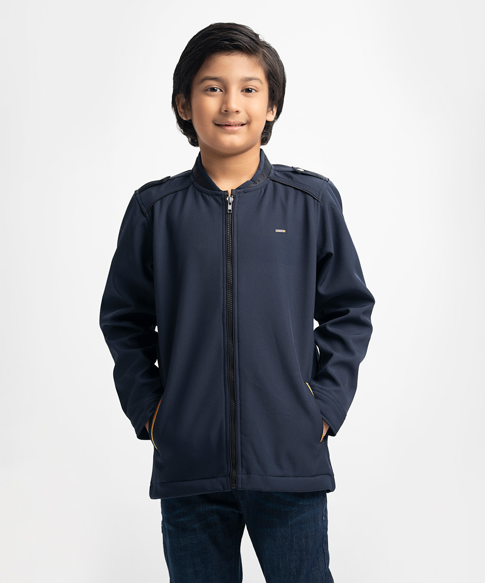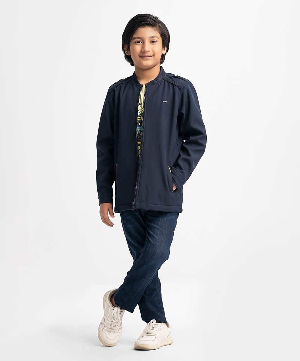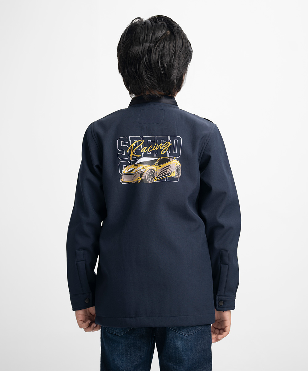 Long-sleeved jacket in fleece fabric. Stand collar with epaulettes on the shoulders. Zip closure and patch pockets. Car print at the back.