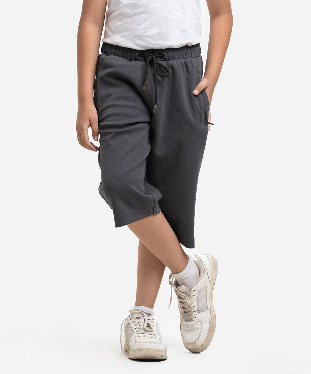 Kids interlock knit three-quarter pant with zipped side pockets. Single patch pocket at the back, elasticated waist with an adjustable drawstring.