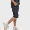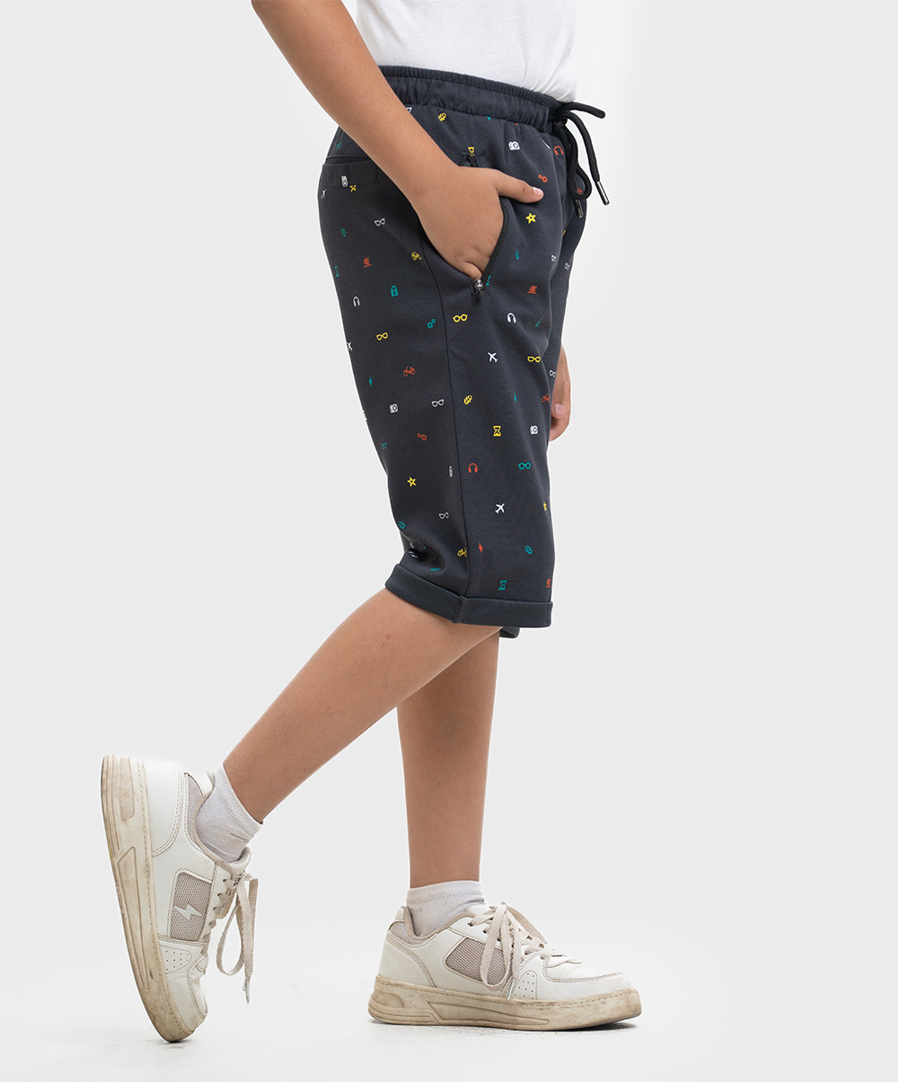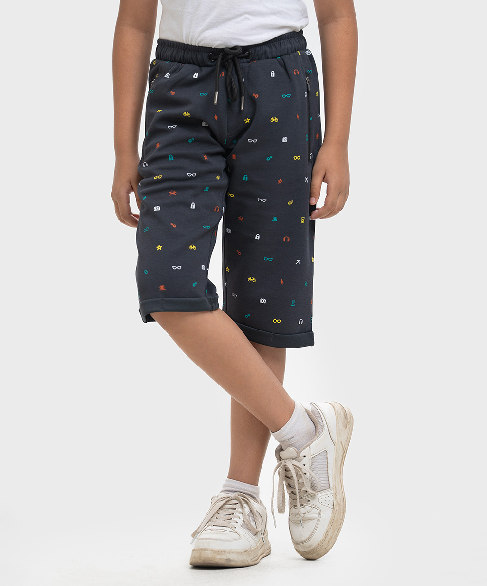 Kid boys printed three quarter pants in Interlock fabric. Two side pockets with twill tape attributes and one back pocket.