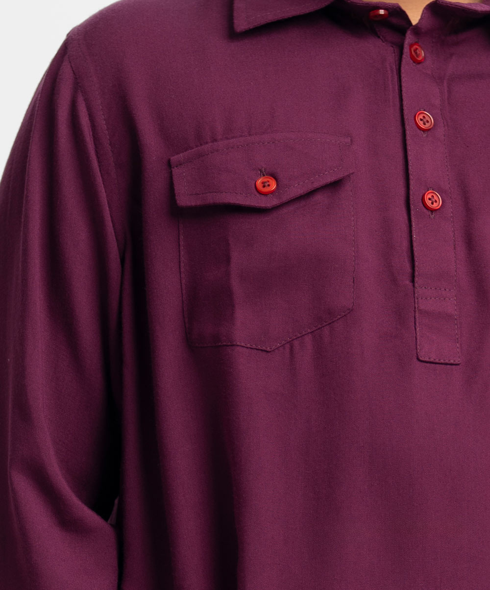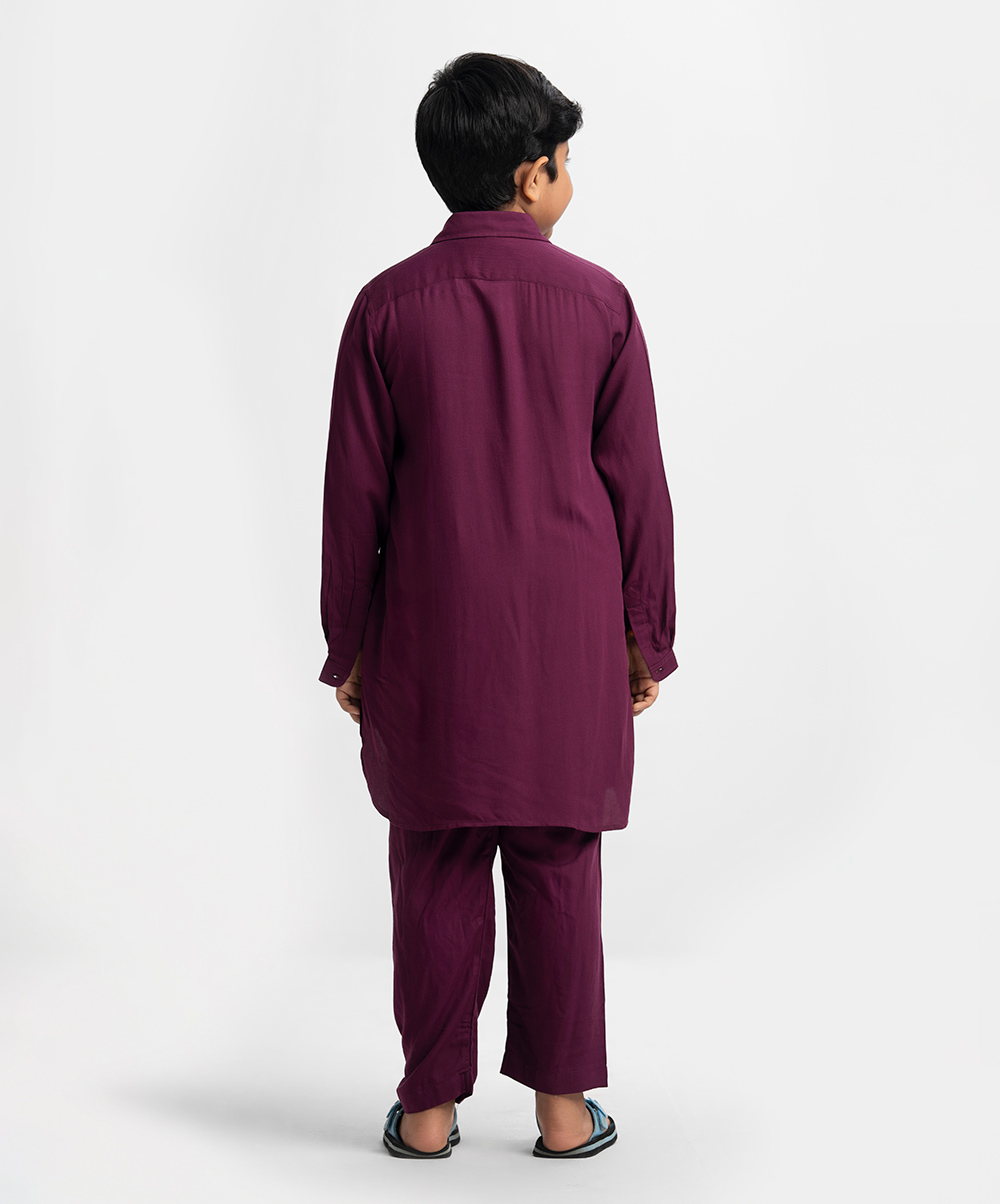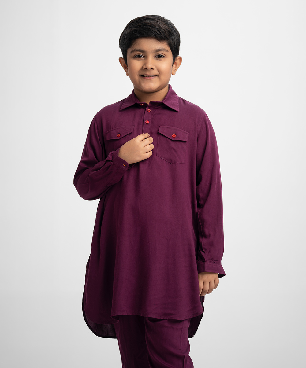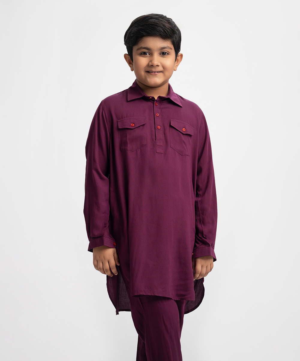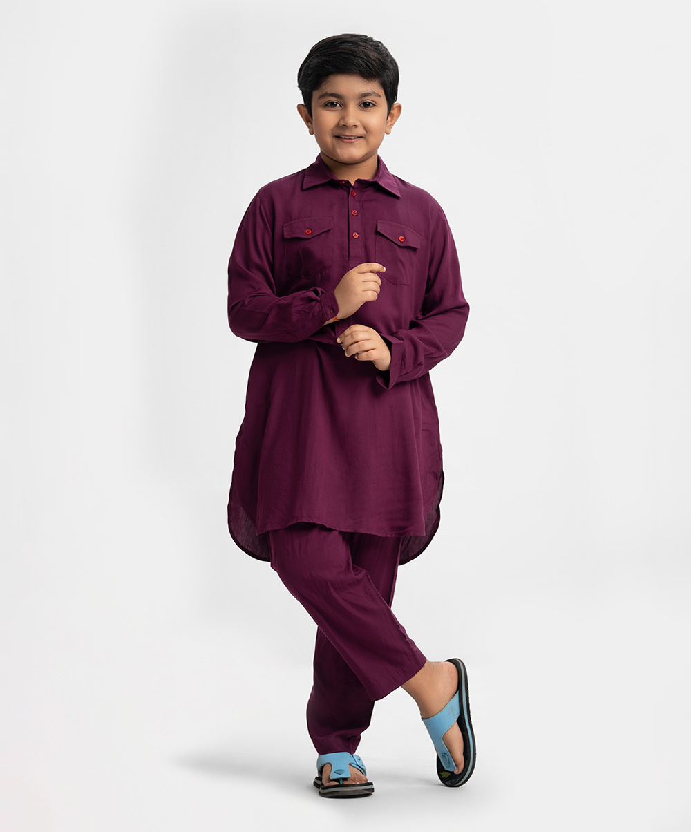 Kids kabli panjabi and pajama set in viscose fabric. Classic collar with double flap pocket on the chest. Inseam pockets on the sides.