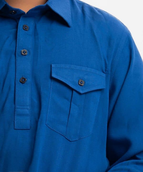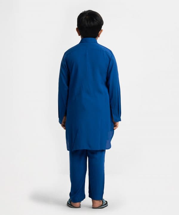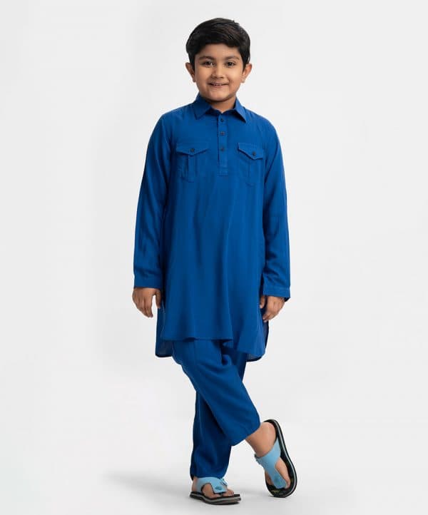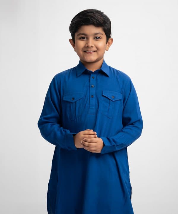 Kids kabli panjabi and pajama set in viscose fabric. Classic collar with double flap pocket on the chest. Inseam pockets on the sides.