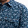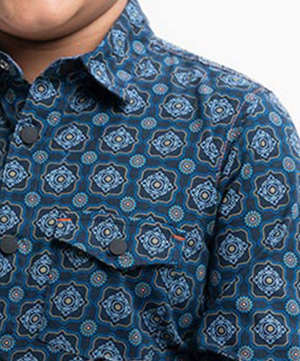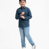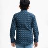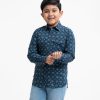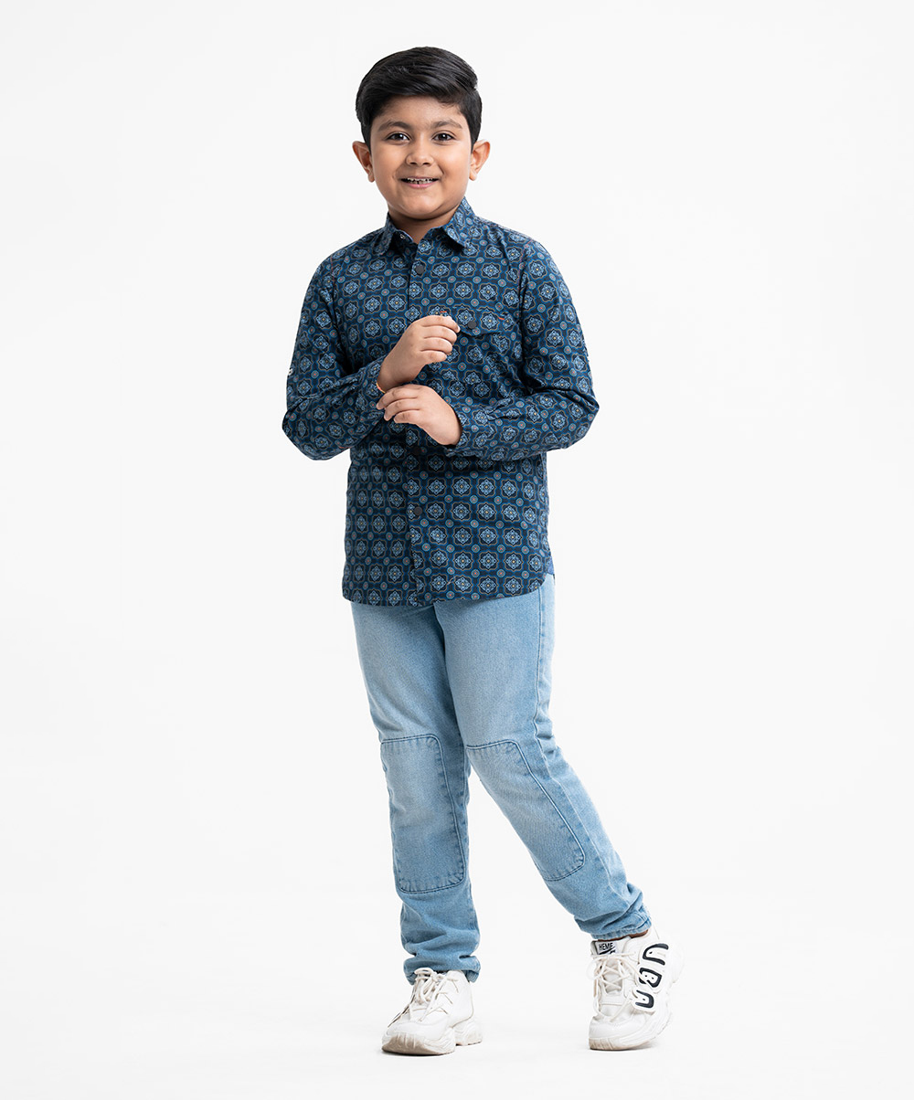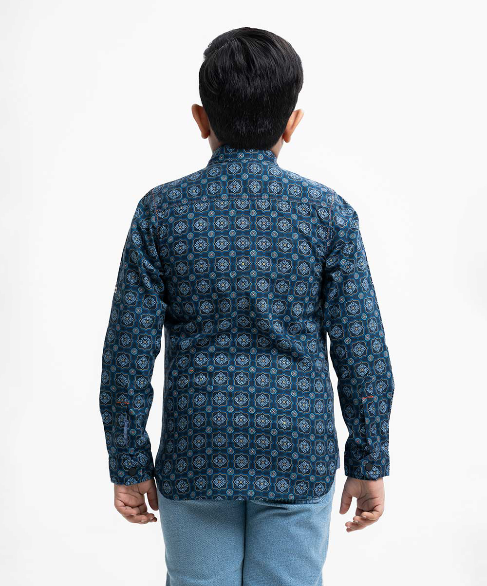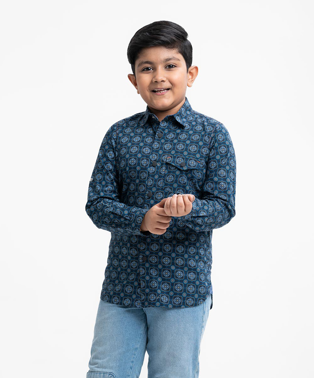Kid boys long sleeve casual shirt in printed cotton fabric. Classic collar with a chest flap pocket.