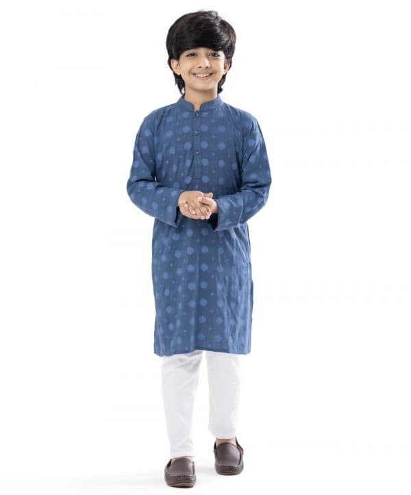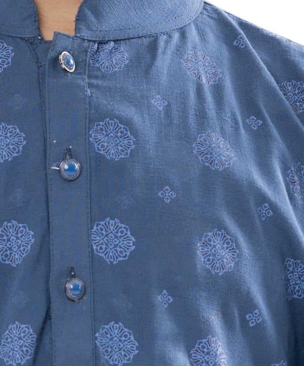 Blue all-over printed Panjabi in slab Viscose fabric. Designed with a mandarin collar and matching metal buttons on the placket.