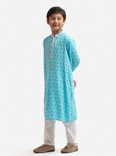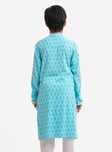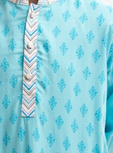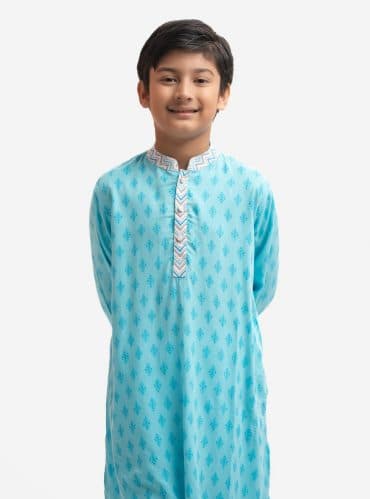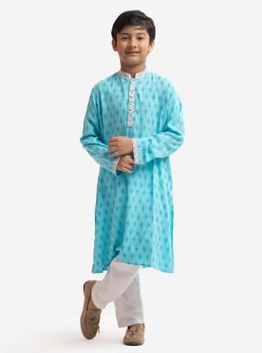 Blue all-over printed Panjabi in slab Viscose fabric. Designed with a mandarin collar and matching metal buttons on the placket.