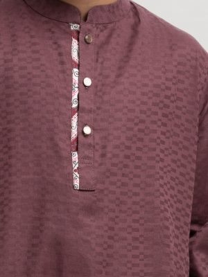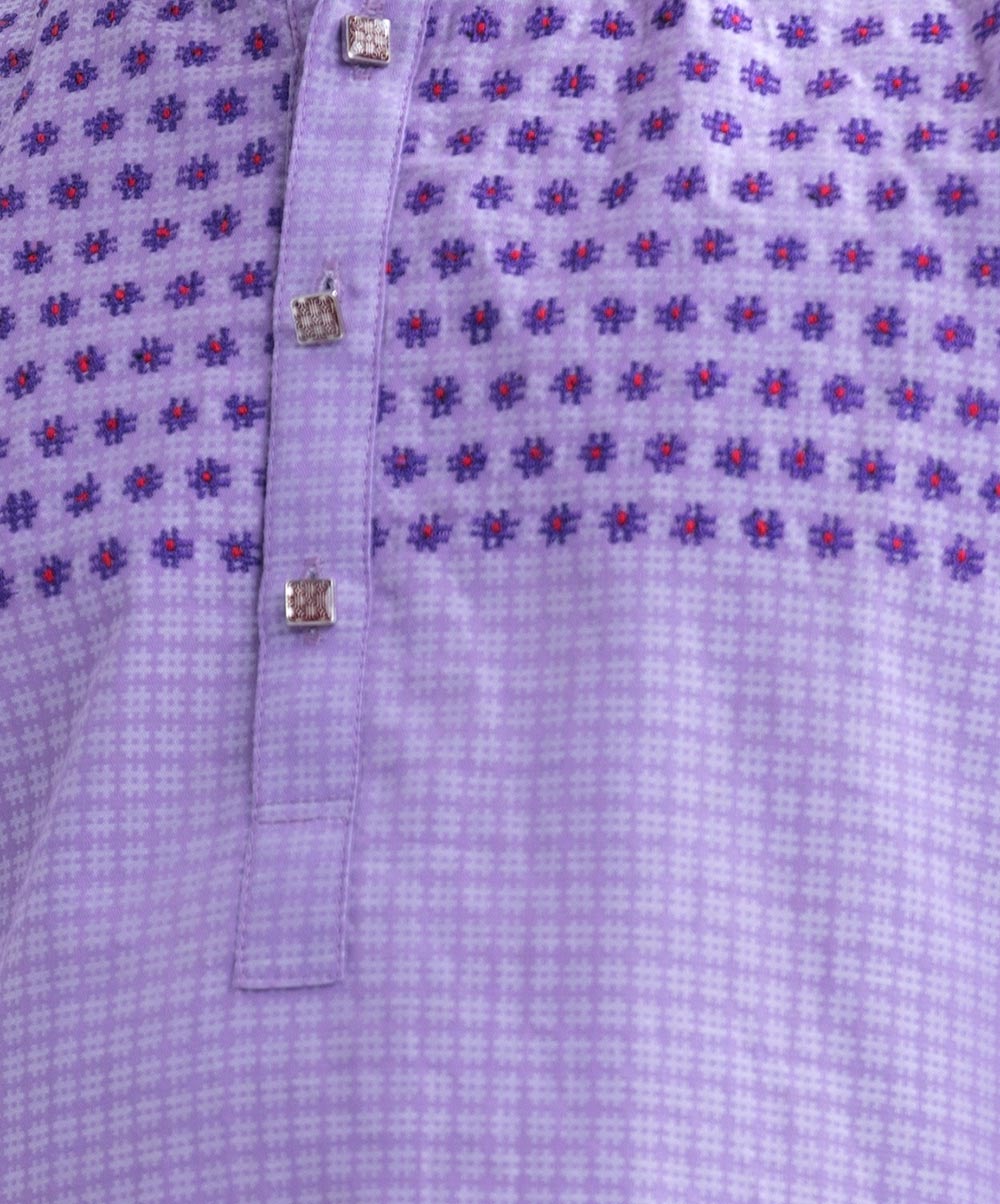 Purple check Panjabi in Jacquard Cotton fabric. Designed with a mandarin collar and matching button placket. Embellished with karchupi at the top front,
