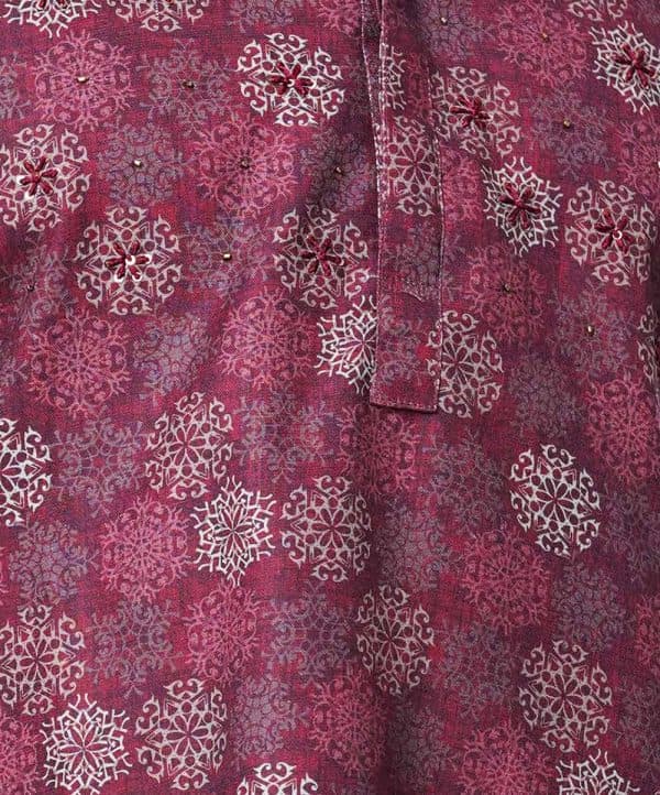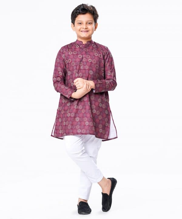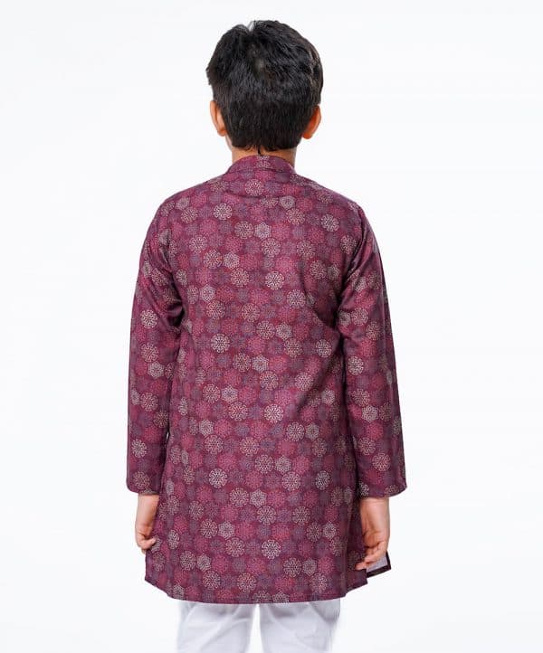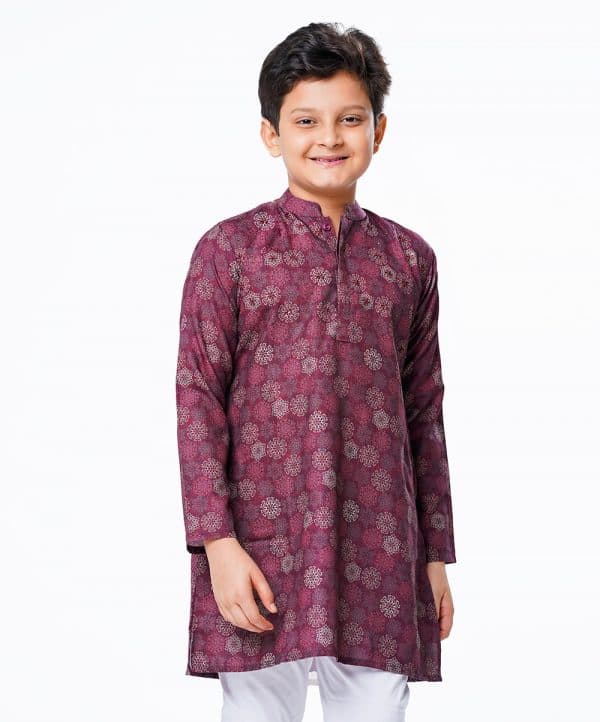 Maroon all-over printed Panjabi in Art-silk fabric. Designed with a mandarin collar and hidden button placket, featuring minimal karchupi at the top front.