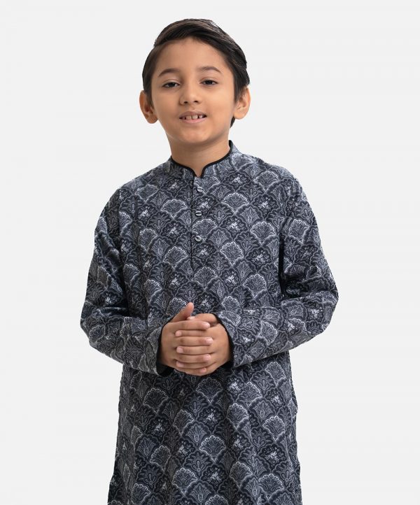 Kid boy’s panjabi in paisley printed cotton fabric. Mandarin collar, buttons placket & full sleeves. Inseam pockets.