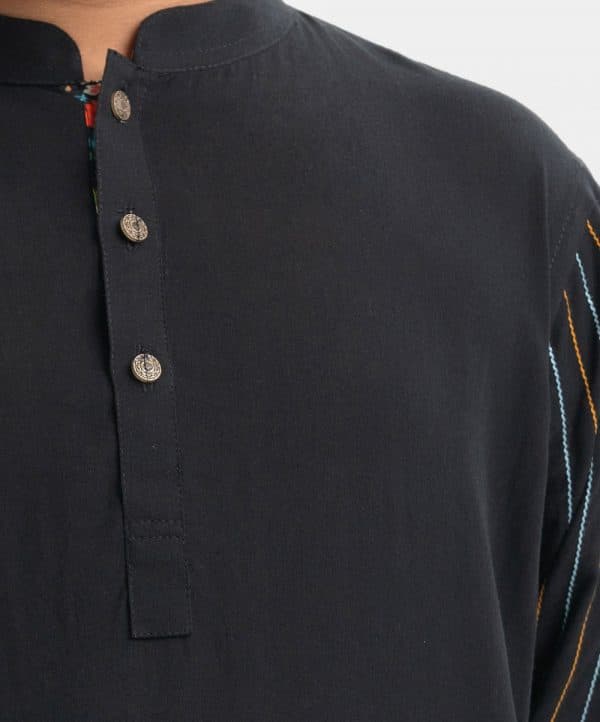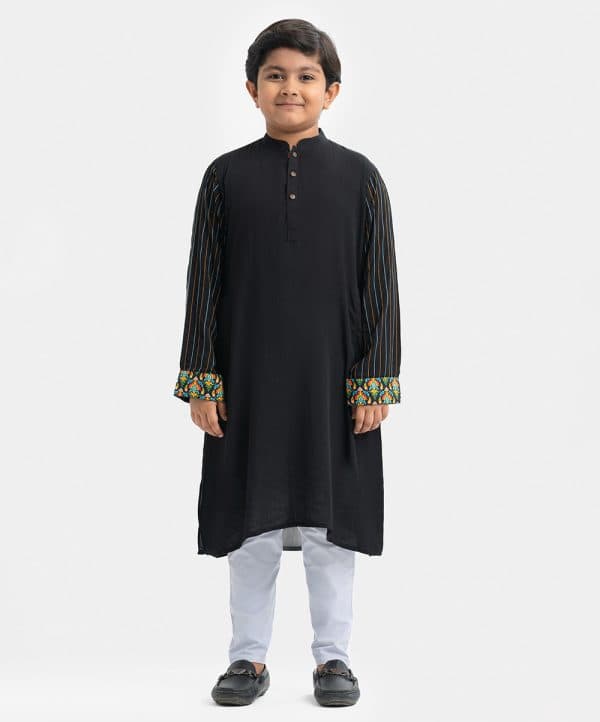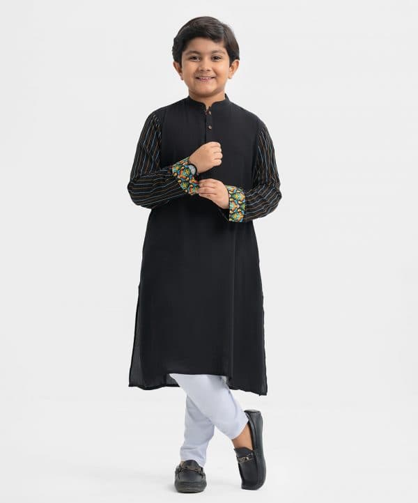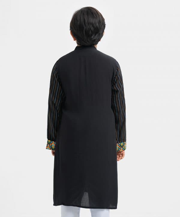 Kid boys panjabi in viscose fabric. Printed cotton fabric patch at the mandarin collar, placket and sleeves hem. Line stitching at full sleeves & inseam pockets.