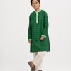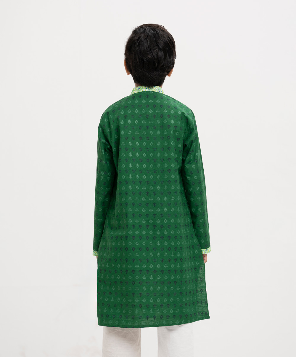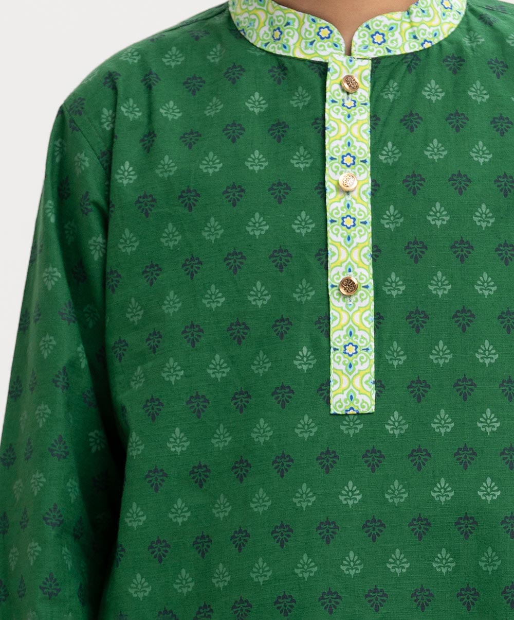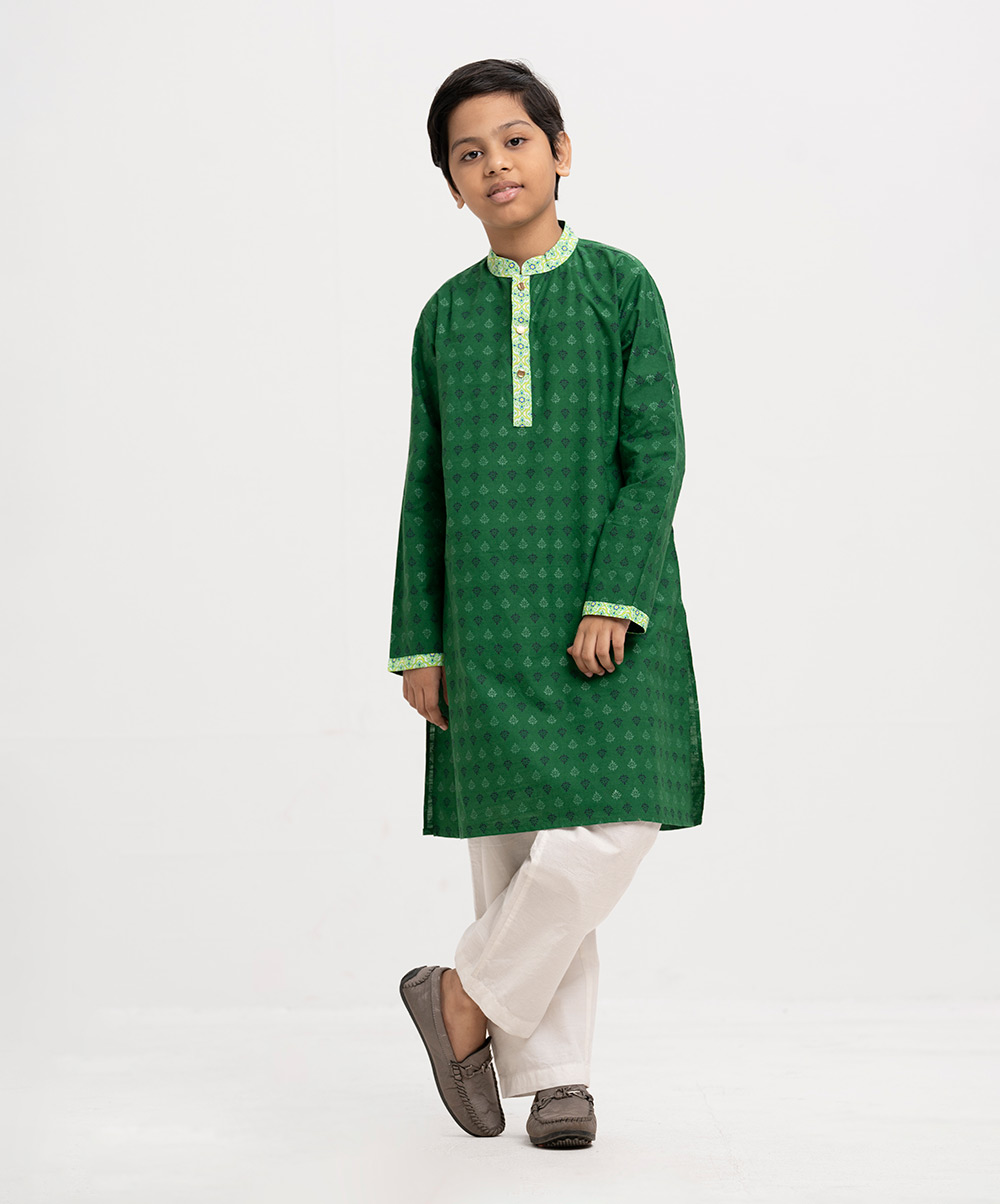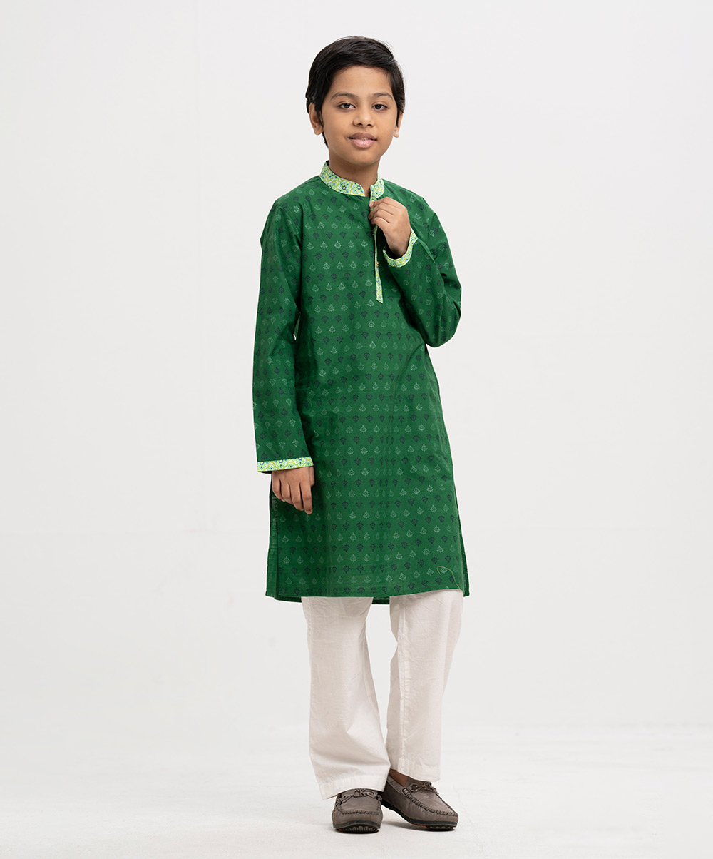 Kid boy’s panjabi in printed cotton fabric. Patch at mandarin collar, buttons placket & full sleeves. Inseam pockets.