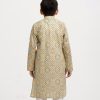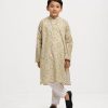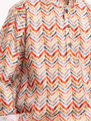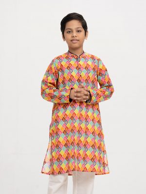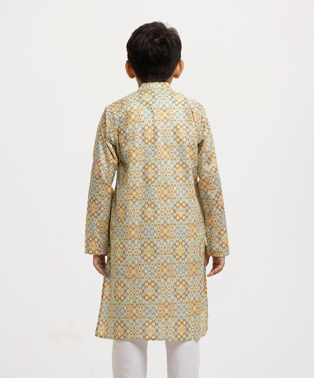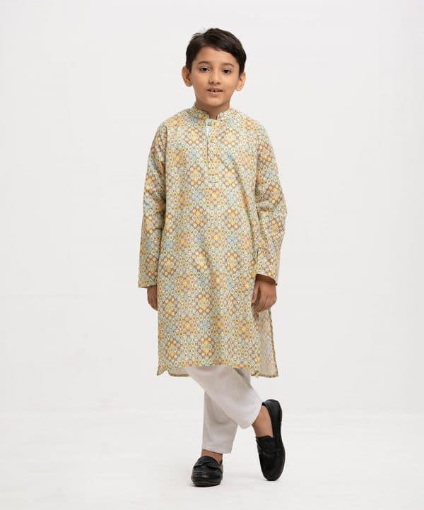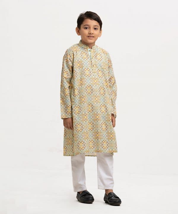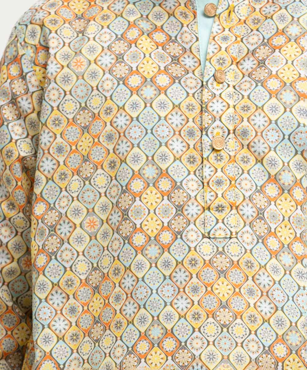 Kid boys’ printed panjabi in cotton fabric. Mandarin collar, inseam pockets and long sleeves.