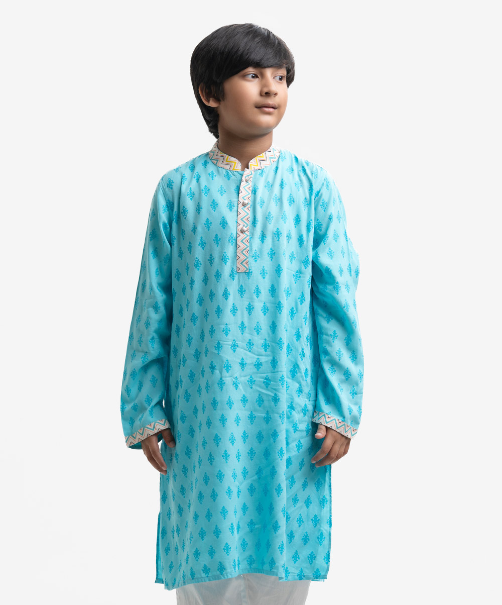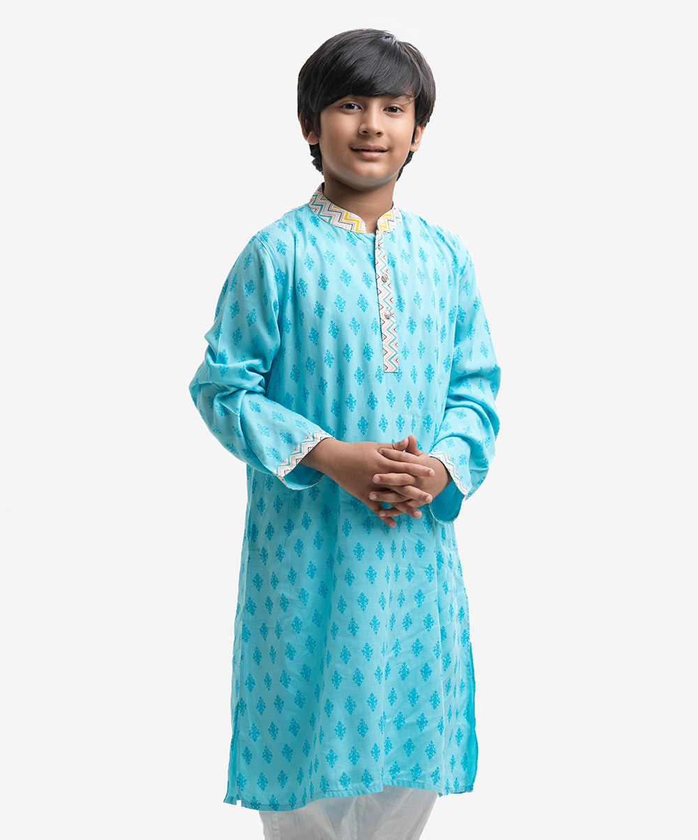 Kids’ ethnic panjabi in viscose fabric with long sleeves and inseam side pockets. Contrast patch on the placket and collar.