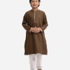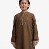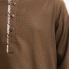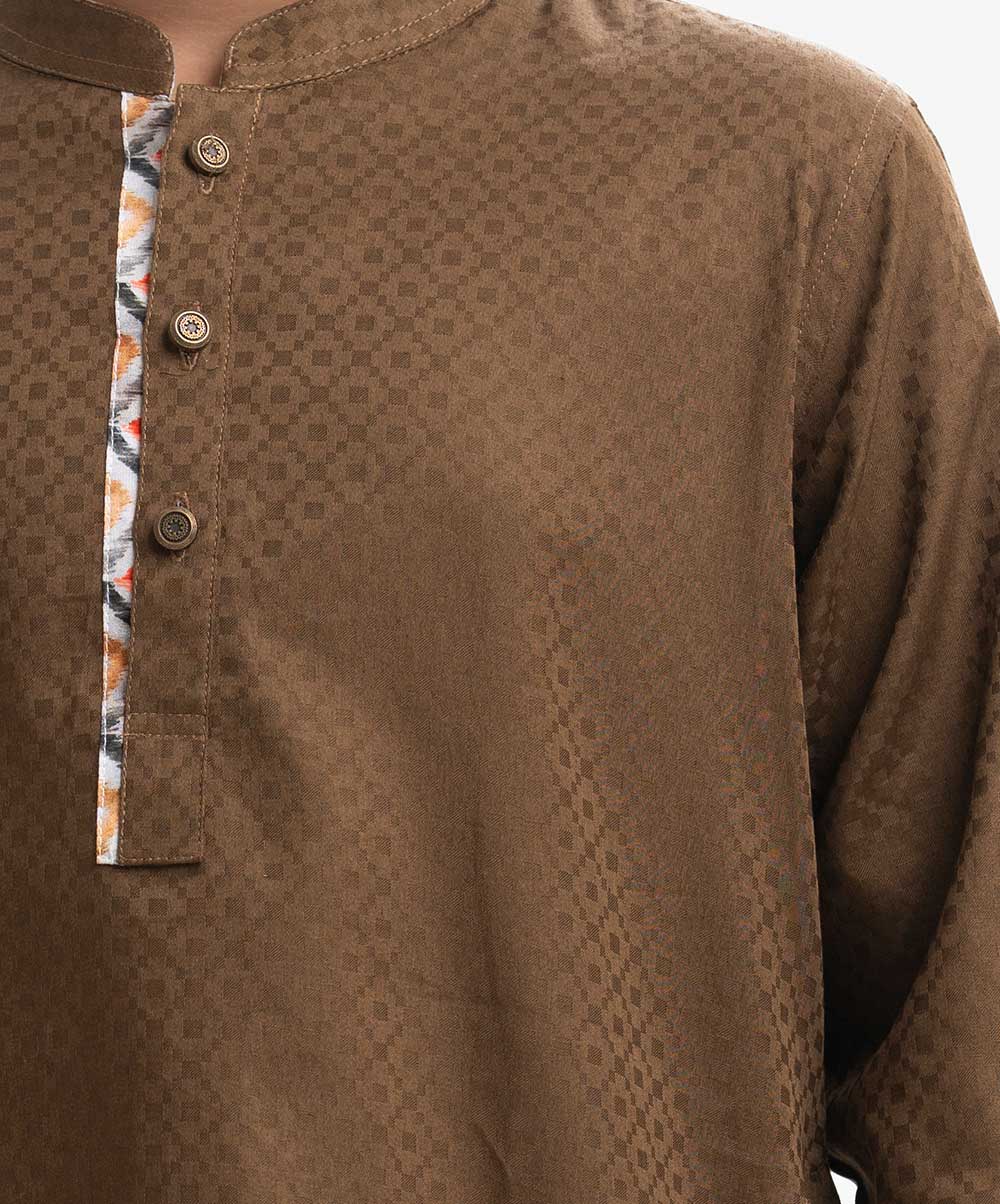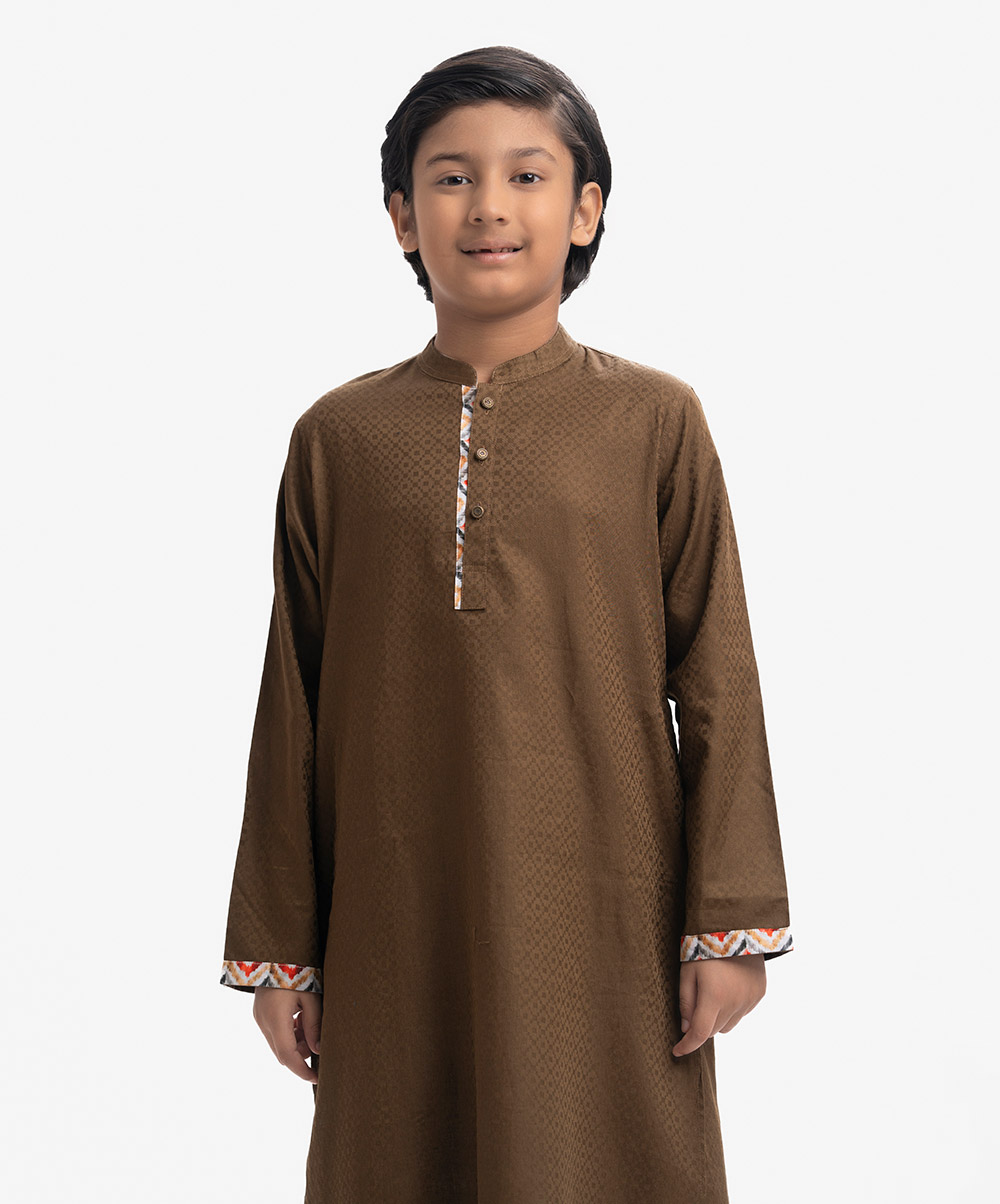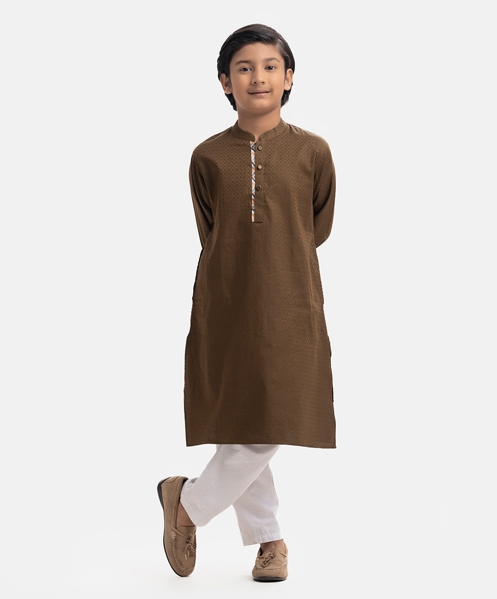 Mandarin collar panjabi in cotton jacquard fabric. Inseam side pockets, contrast patch on the inner collar, placket and cuffs.