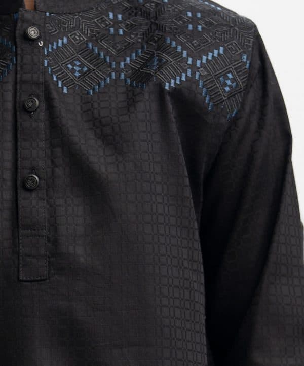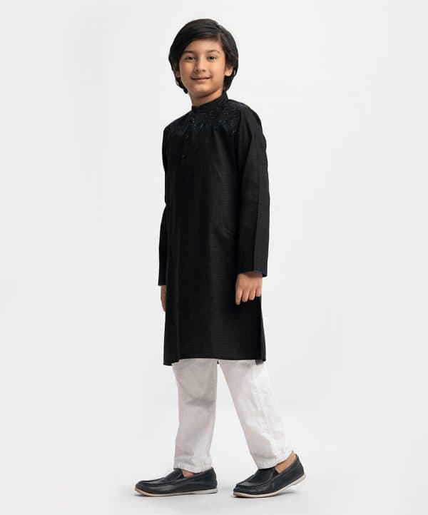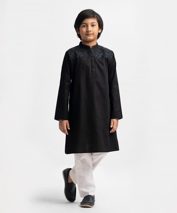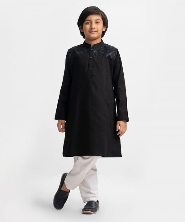 Kid boy’s panjabi in cotton jacquard fabric. Mandarin collar & full sleeves. Embroidery at front & inseam pockets.
