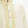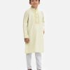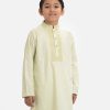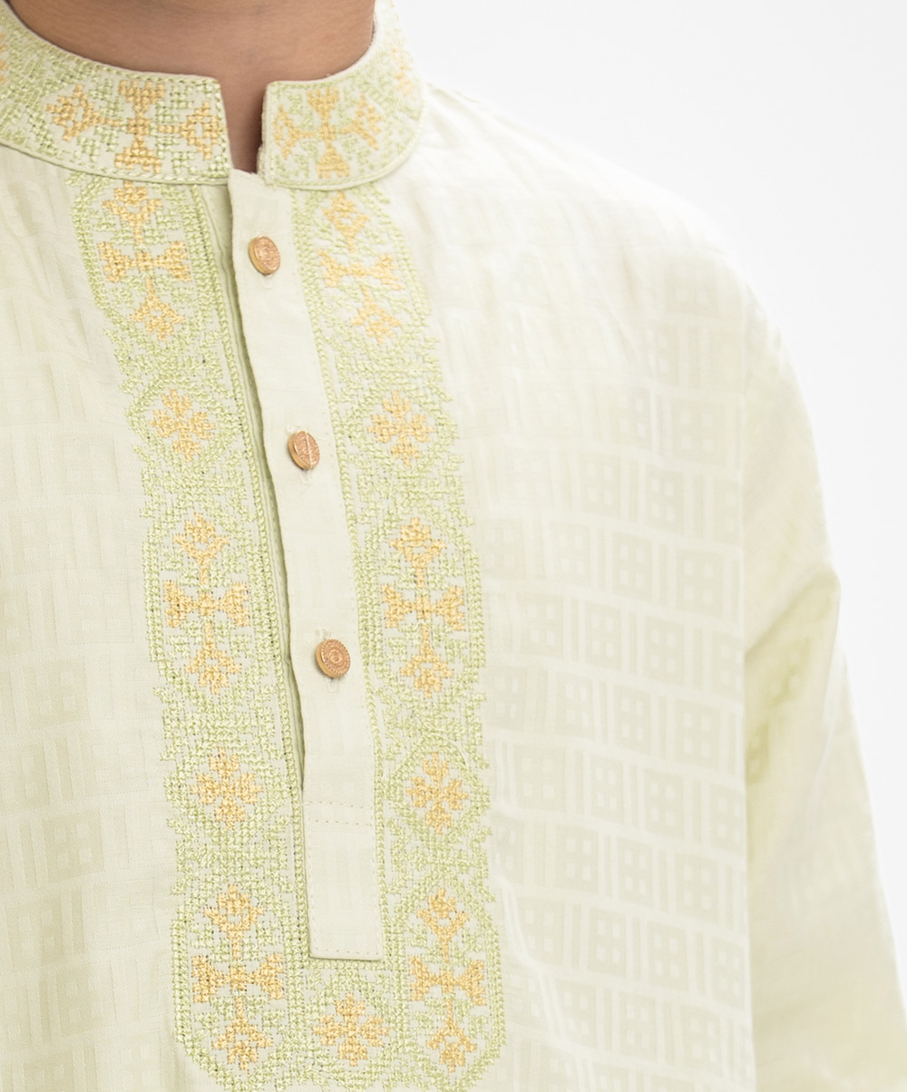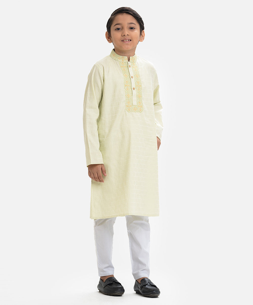 Kid boy’s panjabi in cotton jacquard fabric. Mandarin collar & full sleeves. Embroidery at front & inseam pockets.