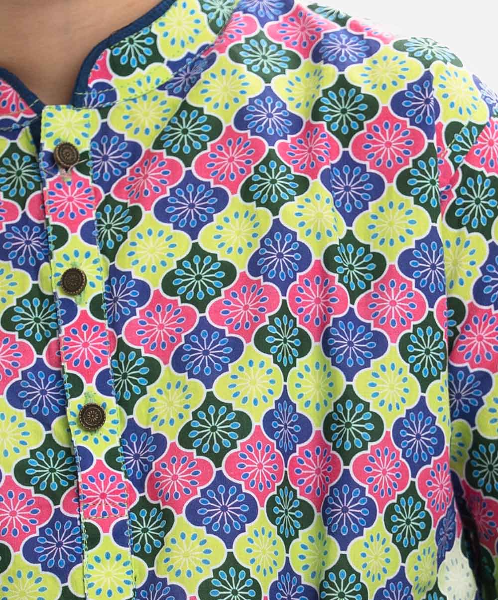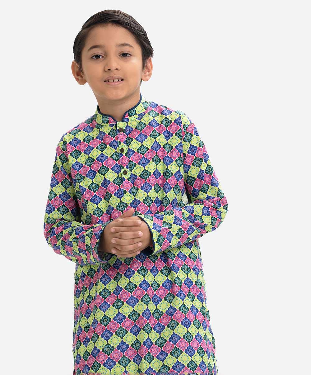 Kid boy’s panjabi in printed cotton fabric. Mandarin collar, buttons placket & full sleeves. Inseam pockets.