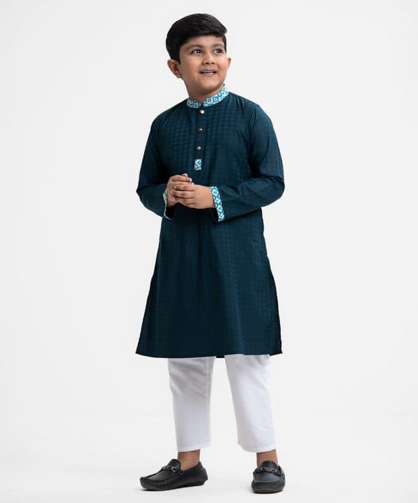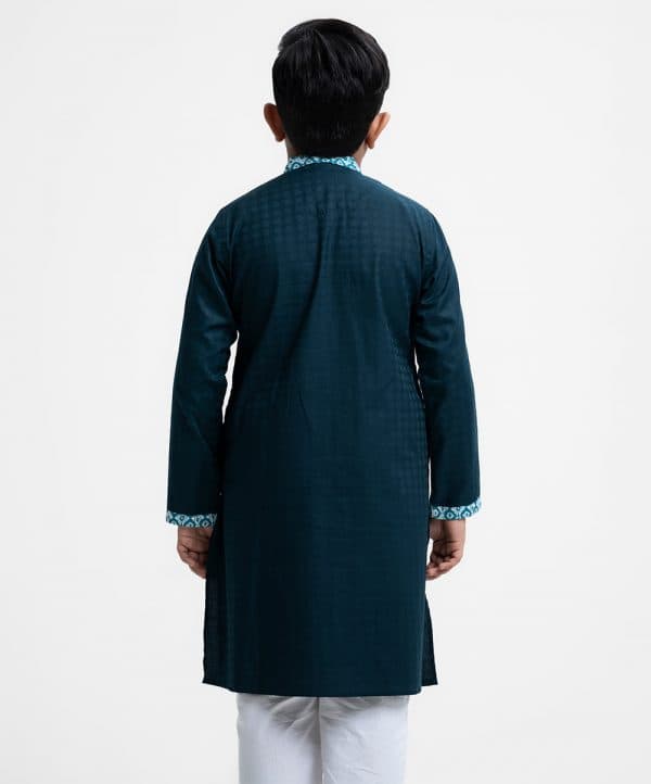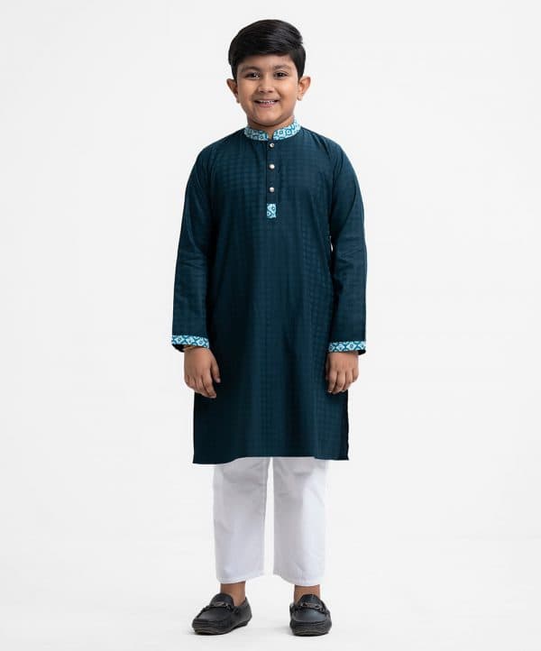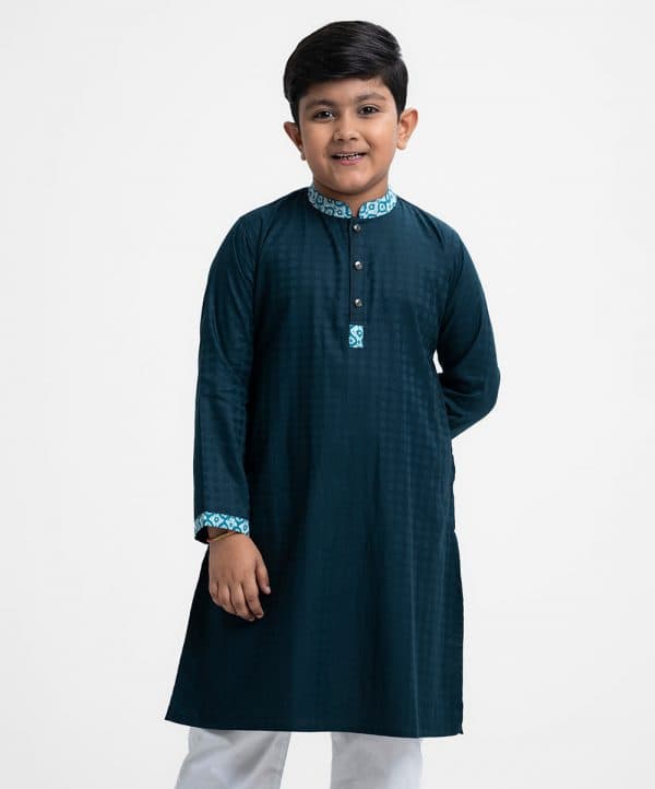 Kid boy’s panjabi in cotton jacquard fabric. Printed cotton fabric patch at mandarin collar, buttons placket & full sleeves cuff. Inseam pockets.