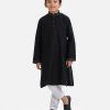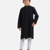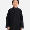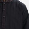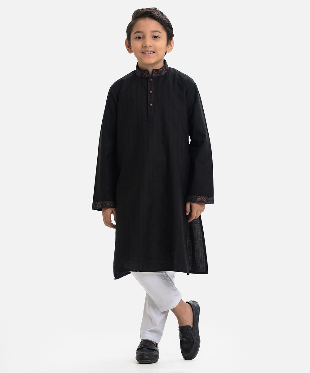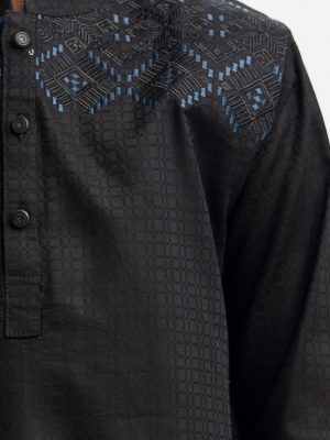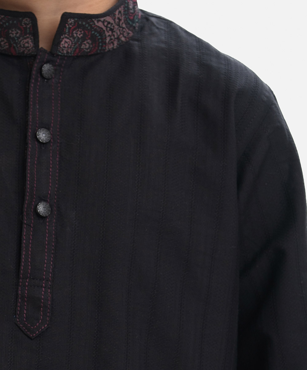 Classic high collar panjabi in cotton jacquard fabric. Matching patch on the collar. Long sleeves with inseam side pockets.