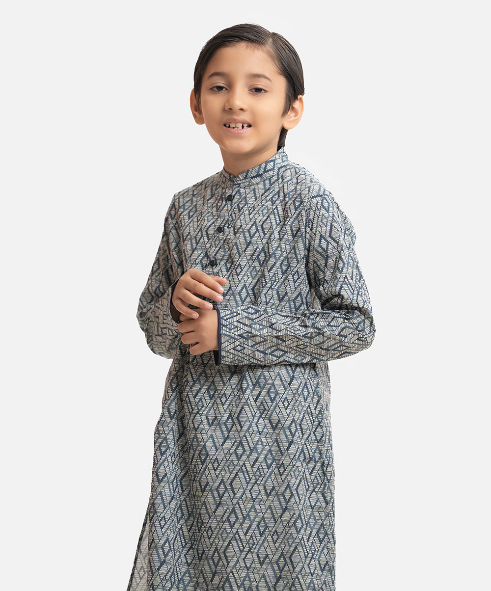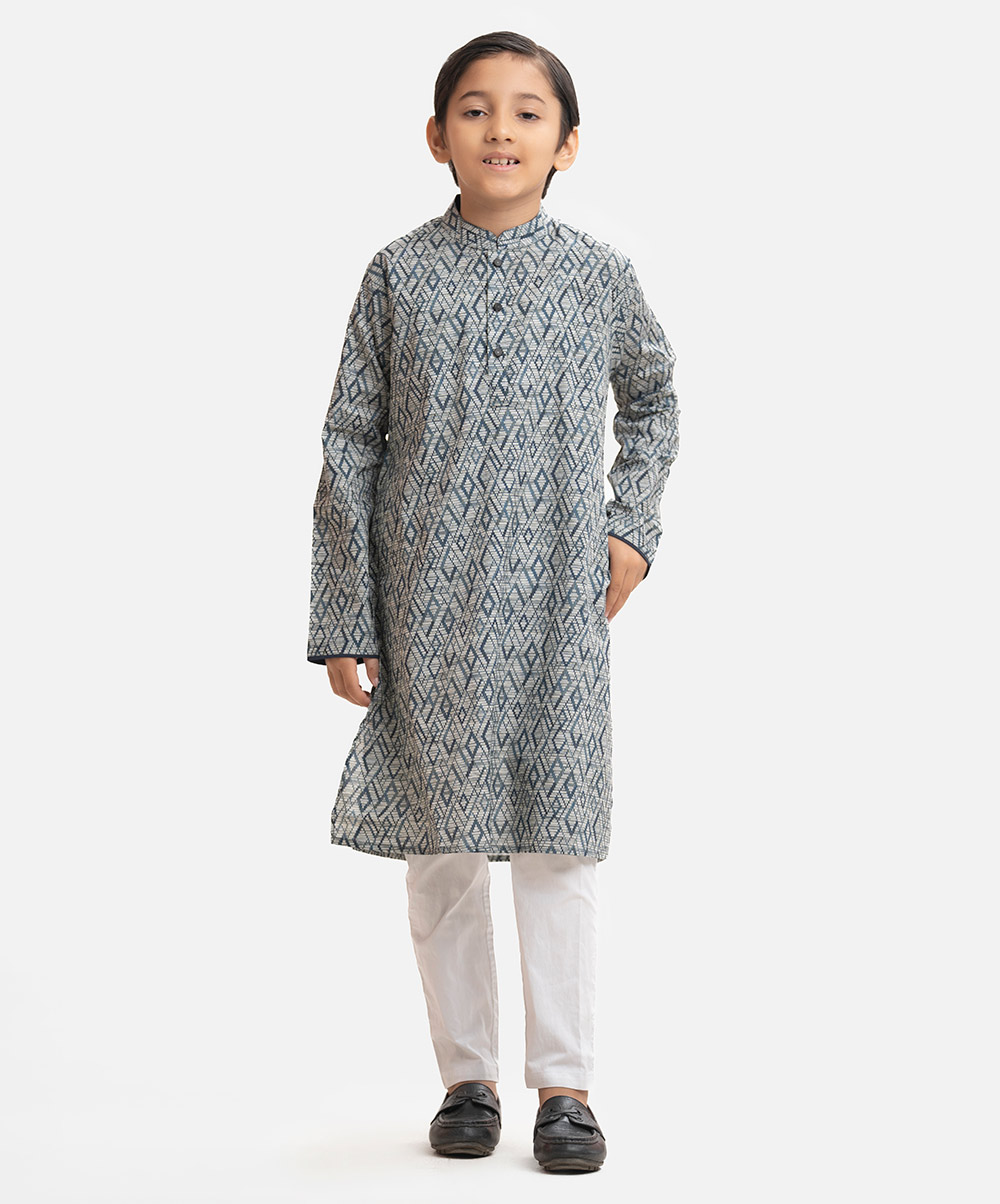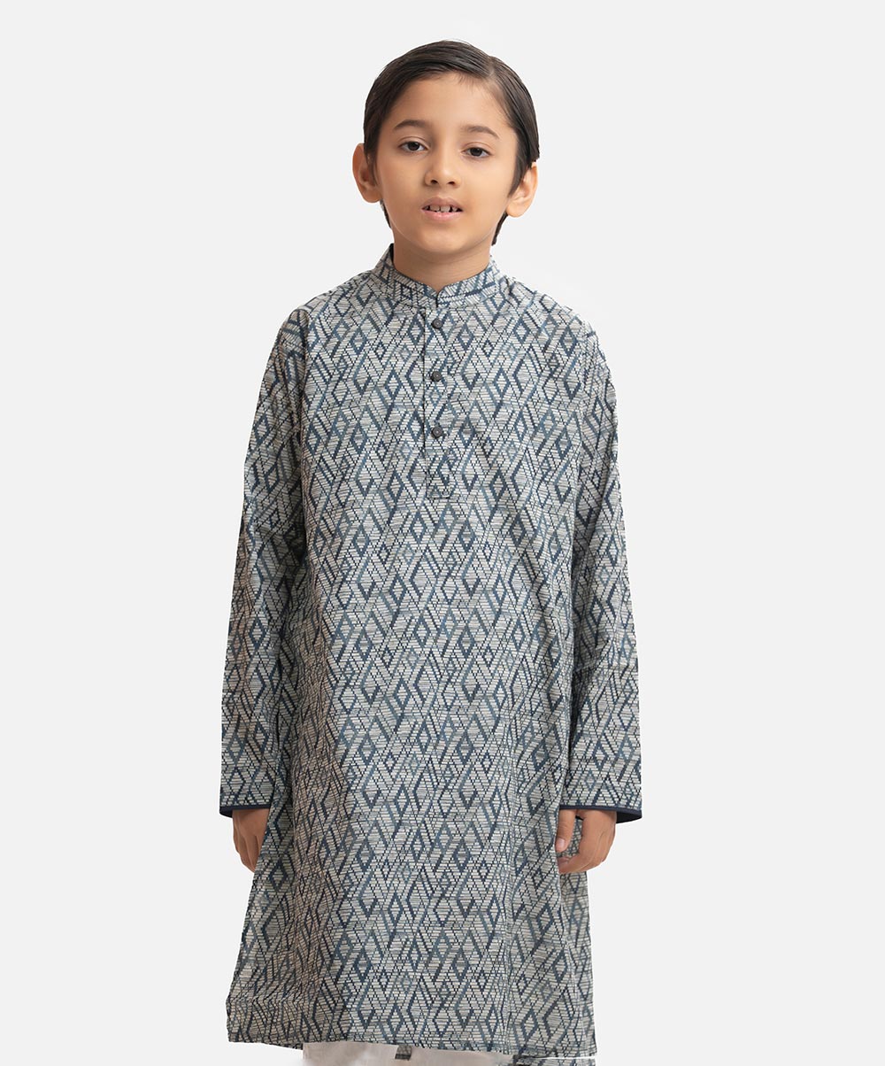 Kid boys panjabi in printed cotton fabric. Mandarin collar and inseam pockets.