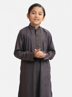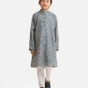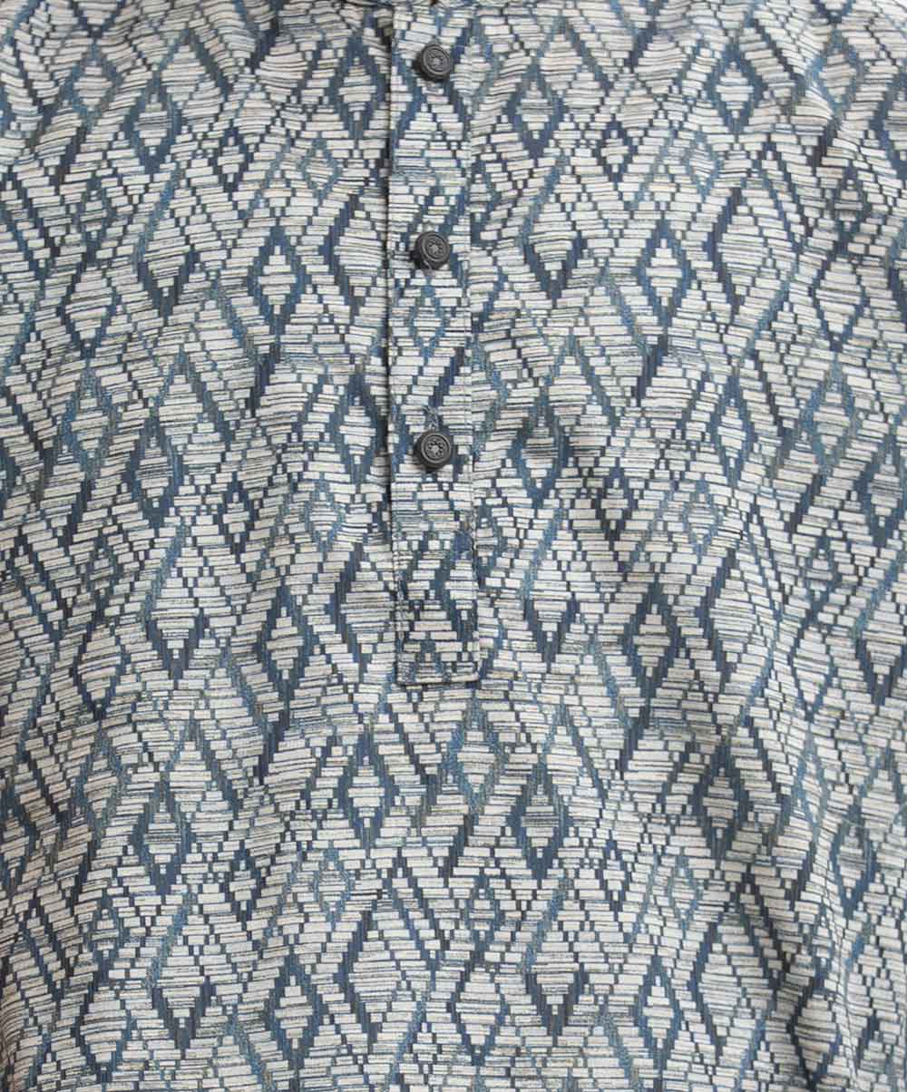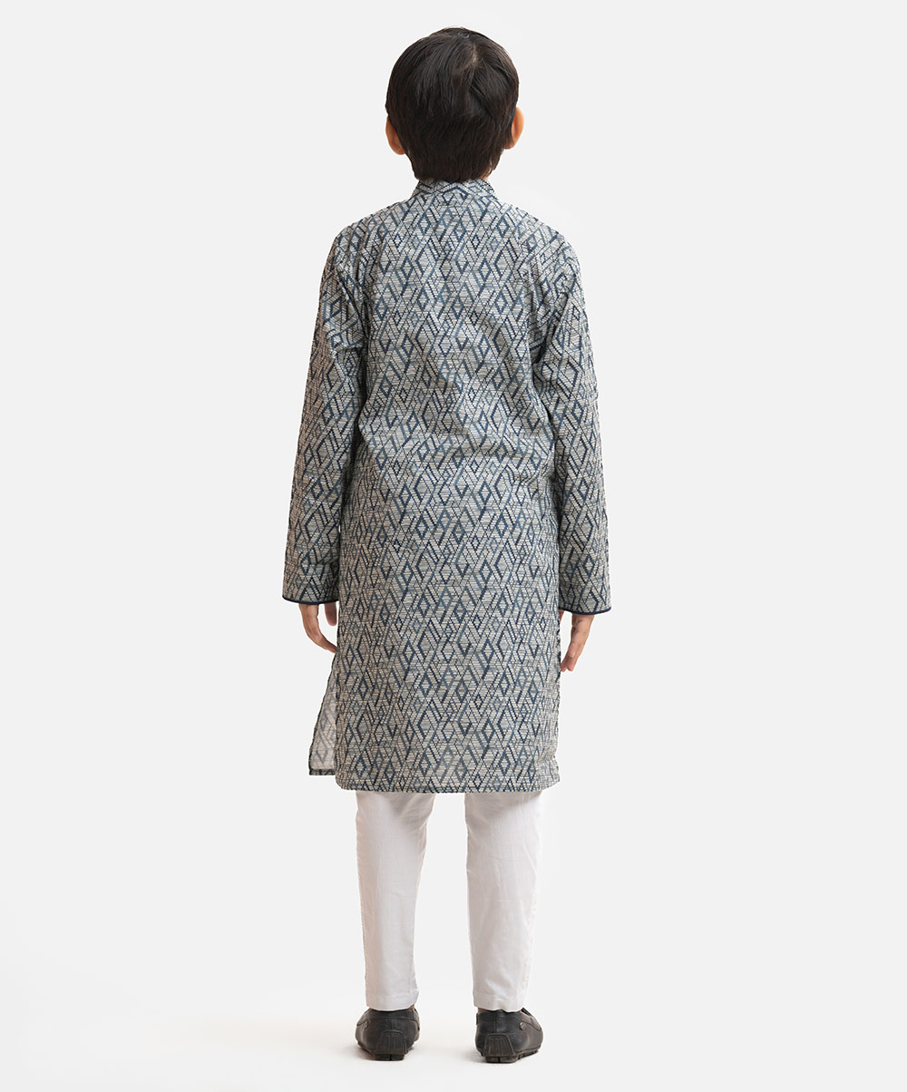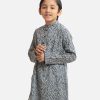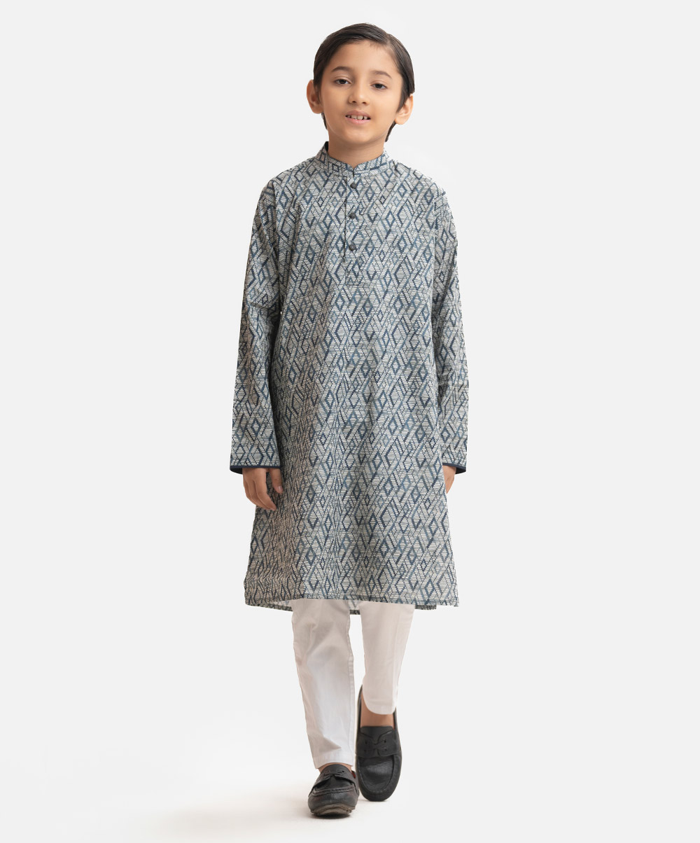 Kid boys panjabi in printed cotton fabric. Mandarin collar and inseam pockets.