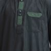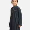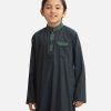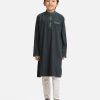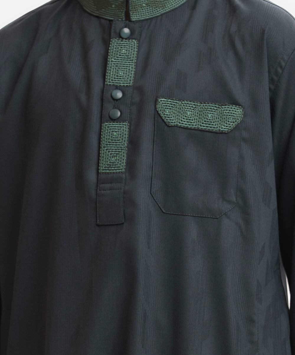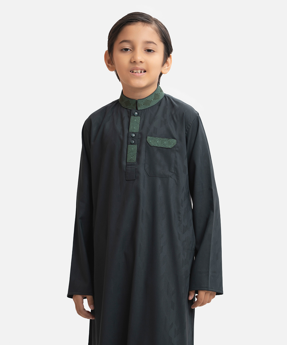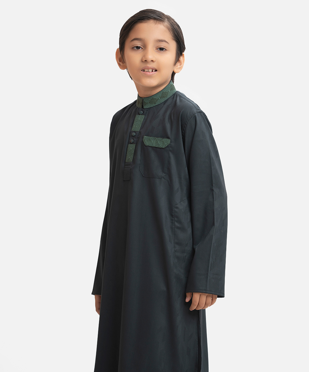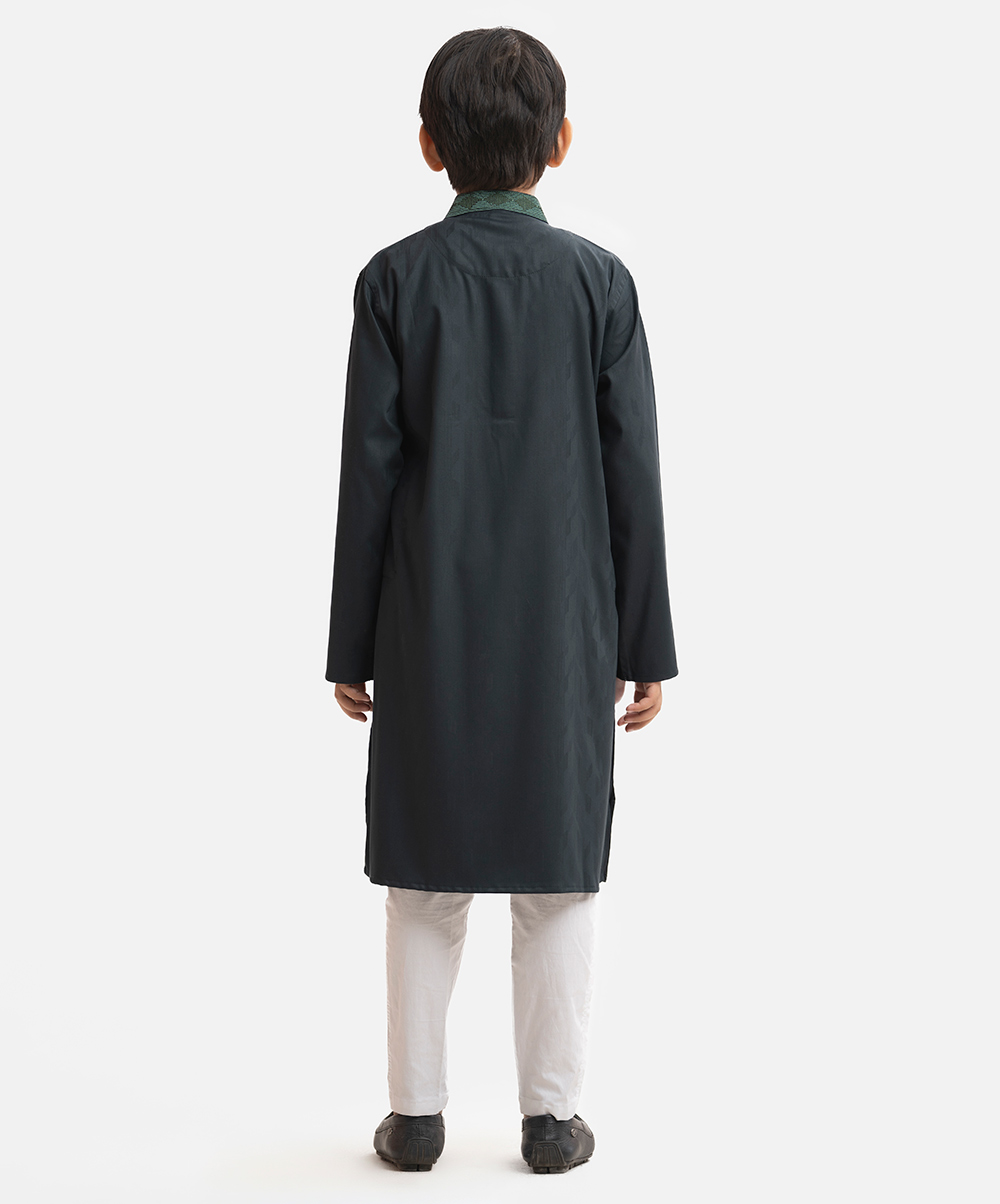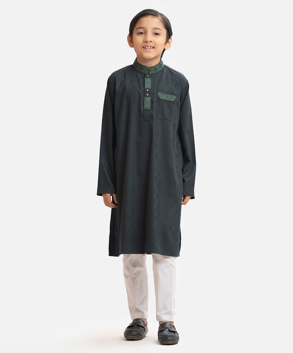 Kid boy’s panjabi in jacquard fabric. Embroidery at mandarin collar, metal buttons placket & a check pocket. Full sleeves & inseam pockets.