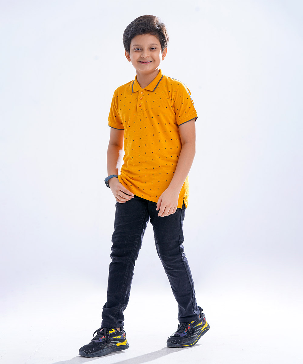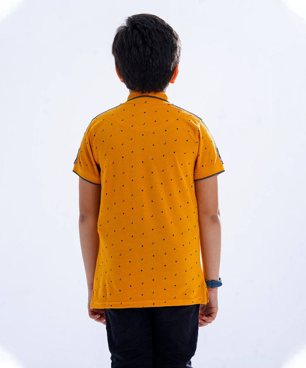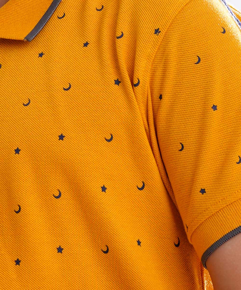 Yellow all-over printed Polo Shirt in Cotton pique fabric. Designed with a classic collar and short sleeves. Contrast tipping at collar and cuffs.