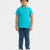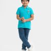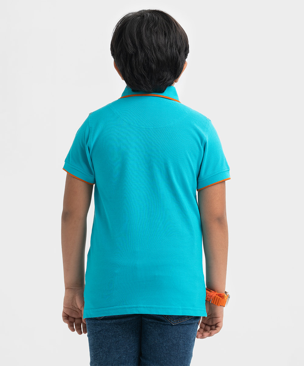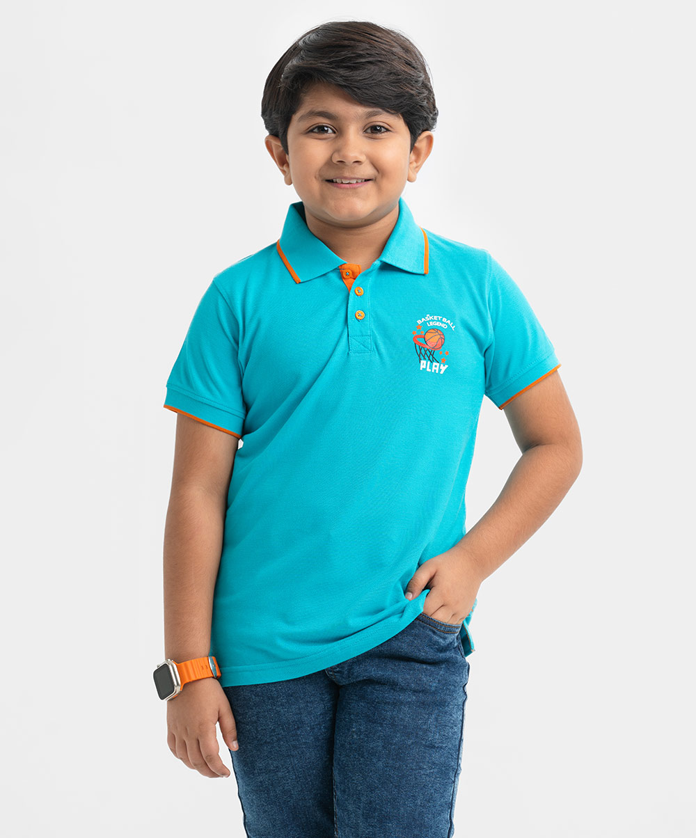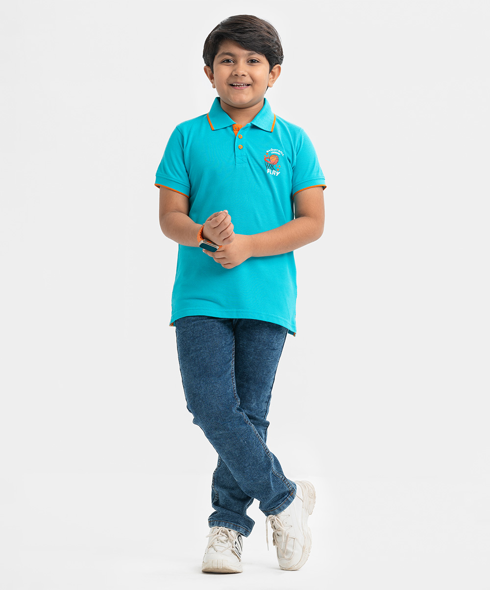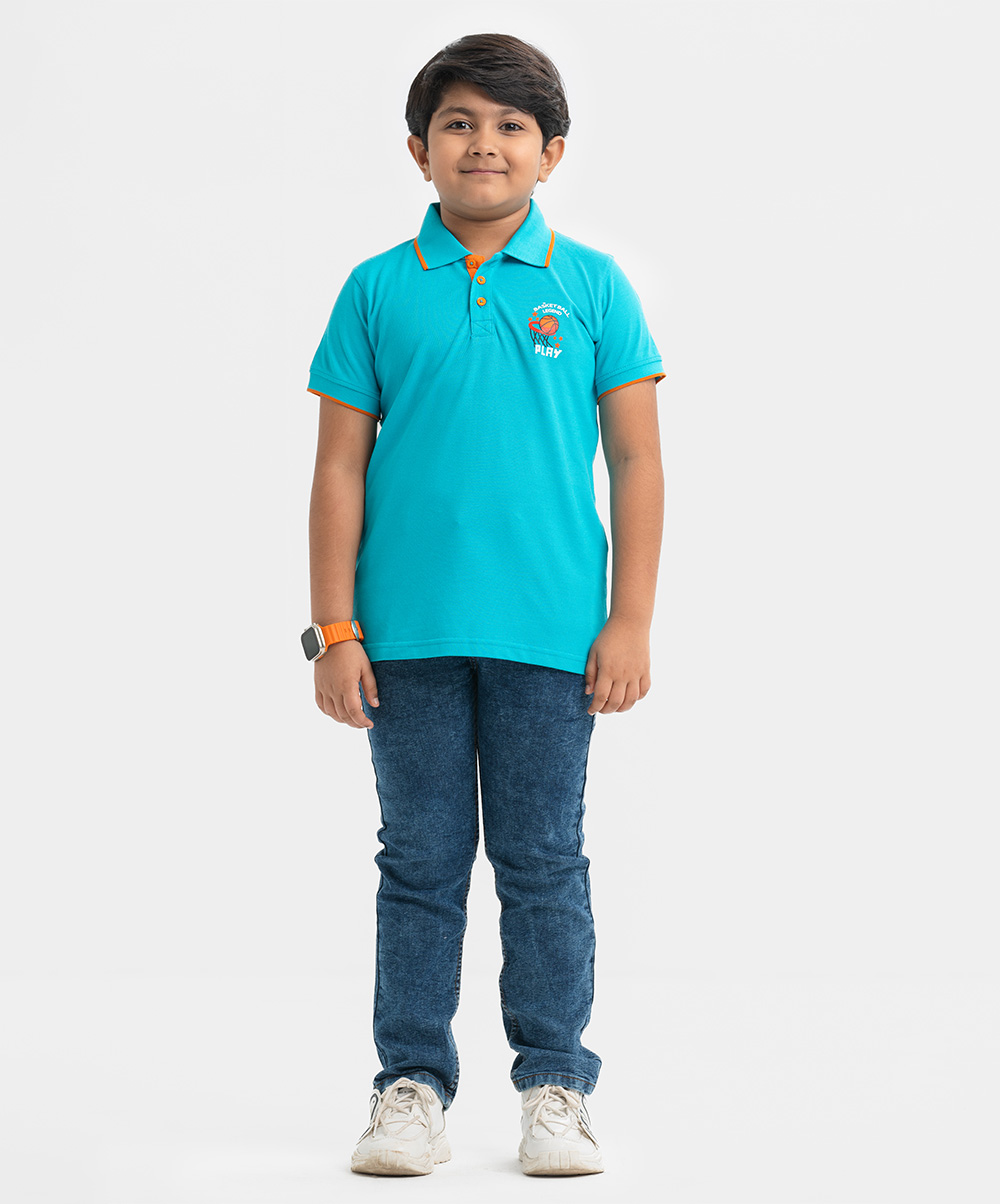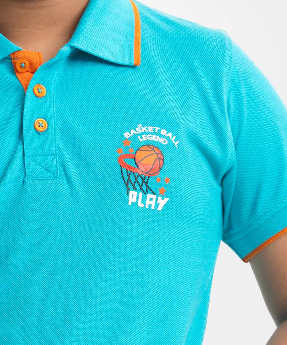 Kid boys’ polo shirt in cotton pique fabric. Classic collar, short sleeves. Print on the chest.