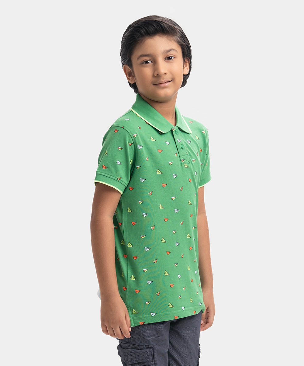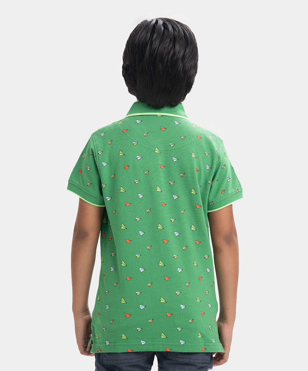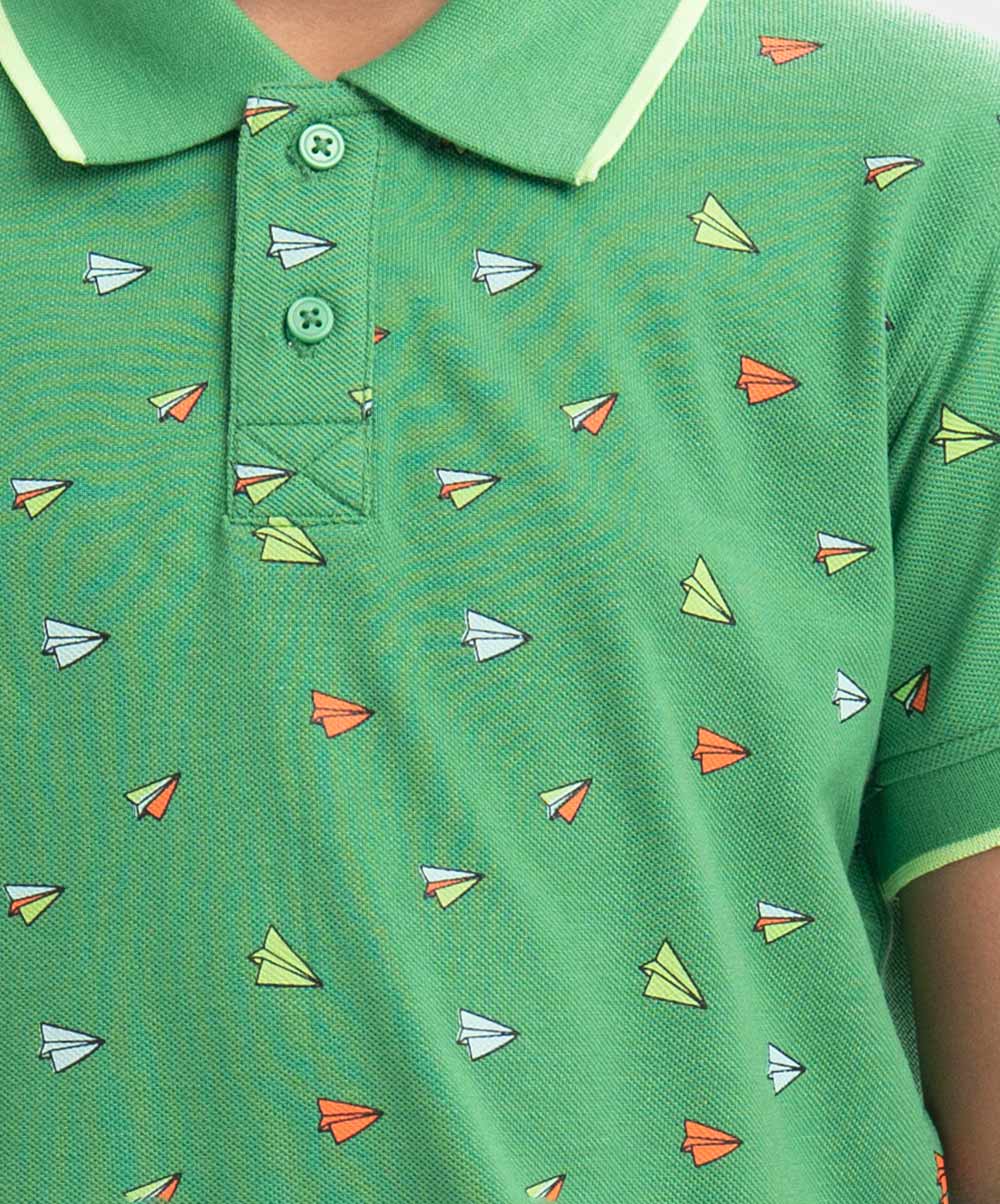 Kid boys Polo in cotton pique fabric. Classic collar, short sleeves and all-over paper plane printed.
