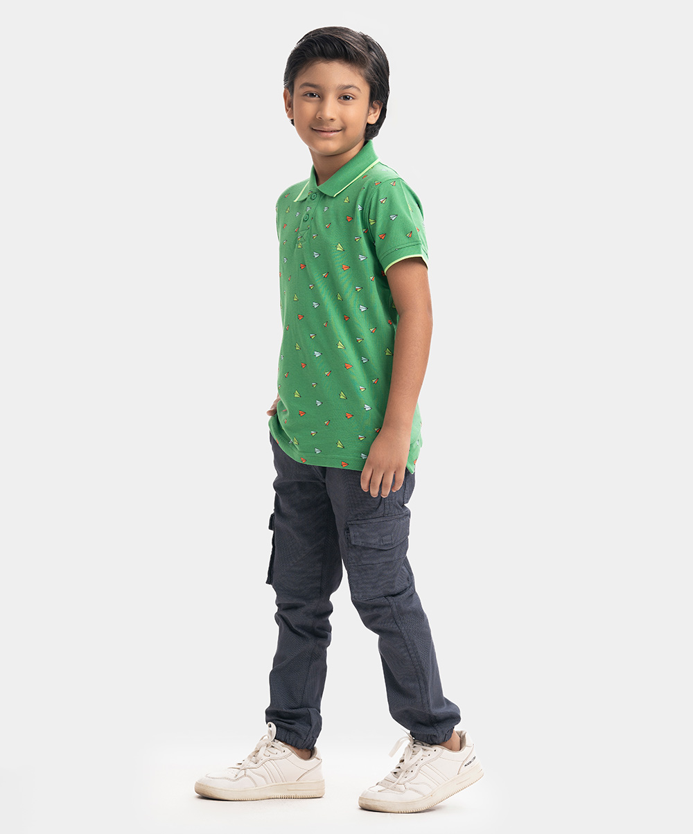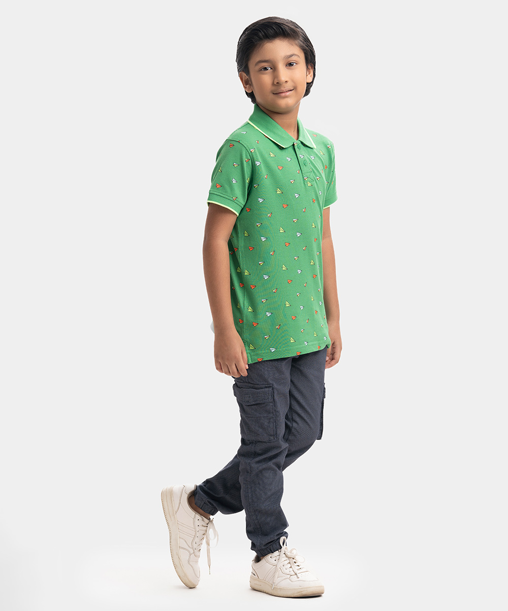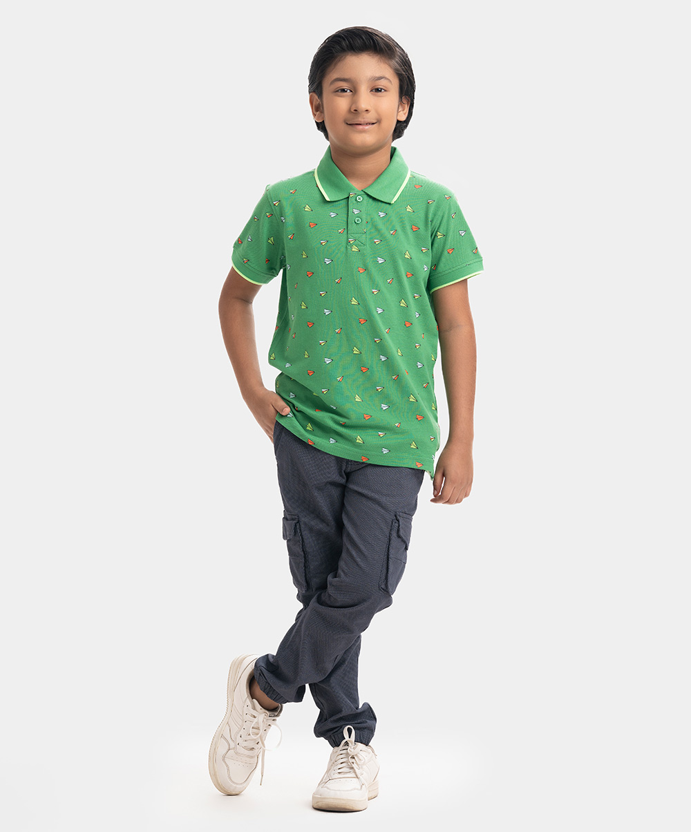 Kid boys Polo in cotton pique fabric. Classic collar, short sleeves and all-over paper plane printed.